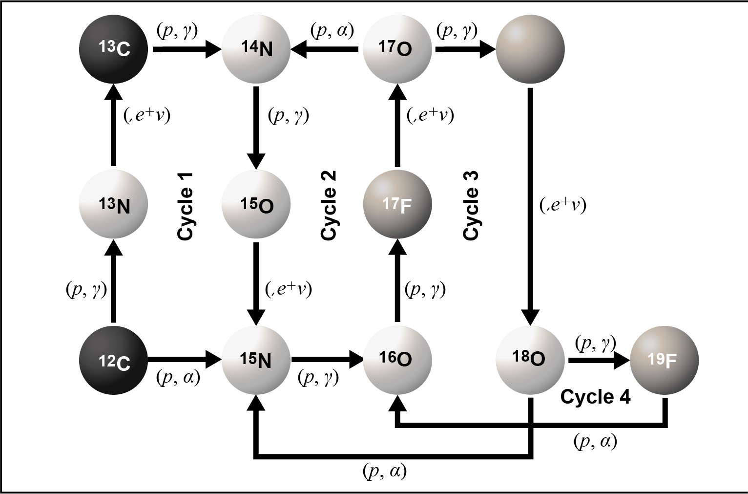 We have just mentioned that the very first Pop III stars were initially composed of nearly pure hydrogen and a fraction of helium. At a certain time, gravitational collapse in denser regions of a primordial hydrogen and helium cloud caused their heating until the cloud became so hot in its center that nuclear burning of H into He began. Consequently proton-proton (pp) chains must be invoked to synthesize 4He in a gas mostly composed of hydrogen and to some minimal extent helium. The pp-chains play a key role to supply the helium needed to produce some of the isotopes involved in the subsequent CNO cycles. Once the ignition started in these H-burning stars, the pp-chains and the CNO cycles ran simultaneously. The net result of the CNO cycles is to produce 4He from 1H. Additionally, the conversion of C, N and O isotopes transforms them mostly into 14N, since the 14N (p, γ) 15O reaction is slower than other involved reactions. Figure 4 shows the full CNO tetra-cycle.