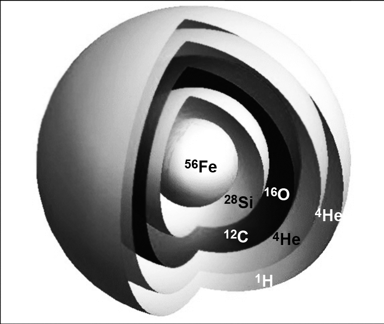 It is therefore predictable that in the final stages of the evolution of these massive stars, the star will adopt an “onion skin” structure with a central core of iron peak elements and successive surrounding shells of silicone, carbon oxygen, helium, and hydrogen (see figure 5).