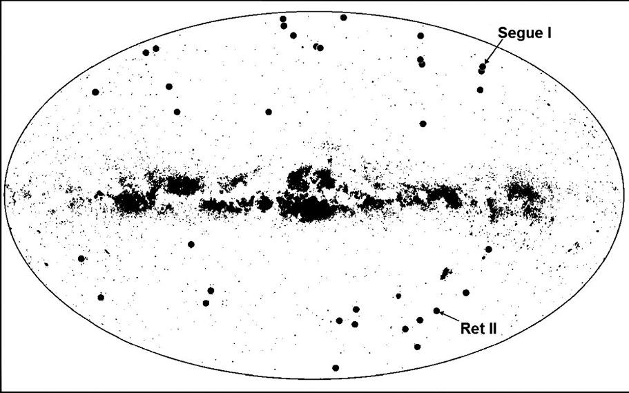 For example, there is a mismatch between observed dwarf galaxy numbers and numerical simulations that predict the evolution of matter distribution in the universe. This is the so called “the Dwarf galaxy problem” also known as the missing satellites problem. That is, the number of small ultrafaint dwarf (UFD) galaxies is orders of magnitude lower than expected from simulation (Simon, 2019). Figure 7 shows the Milky Way and UFD satellites.