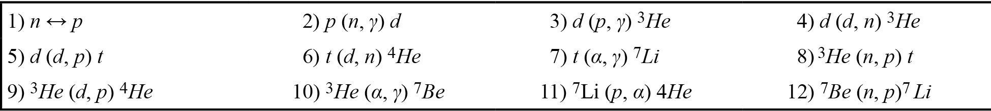 The SBBN model predictions also depend on the nuclear reaction network (figure 1) and values of nuclear cross sections. The main reactions involved in the Big Bang Nucleosynthesis period are shown in table 1. Reactions occur among neutrons (n), protons (p), deuterium (d), tritium (t), and the first created elements: H, He, Li and Be.