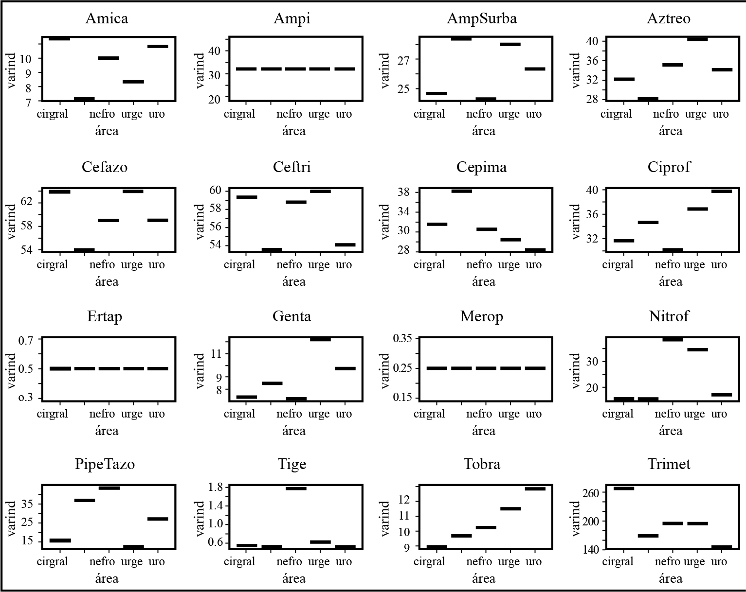Para este estudio, sólo se puso en ejecución el análisis de cinco áreas (cirugía general, medicina interna, nefrología, urgencias y urología) por cada antibiótico usado para el antibiograma de las cepas aisladas con el objetivo de analizar interacción de antibióticos con las áreas del hospital. Esto permite saber en qué áreas el tratamiento comienza a ser deficiente, constante o adecuado (figura 1). Por ejemplo, para el caso de ampicilina y carbapenémicos, como existe una sensibilidad alta, se mantiene constante la dosis entre áreas en contraste con cefalosporinas de tercera generación, donde se requieren mayores concentraciones en las áreas de cirugía general y urgencias a fin de mantener un efecto similar.