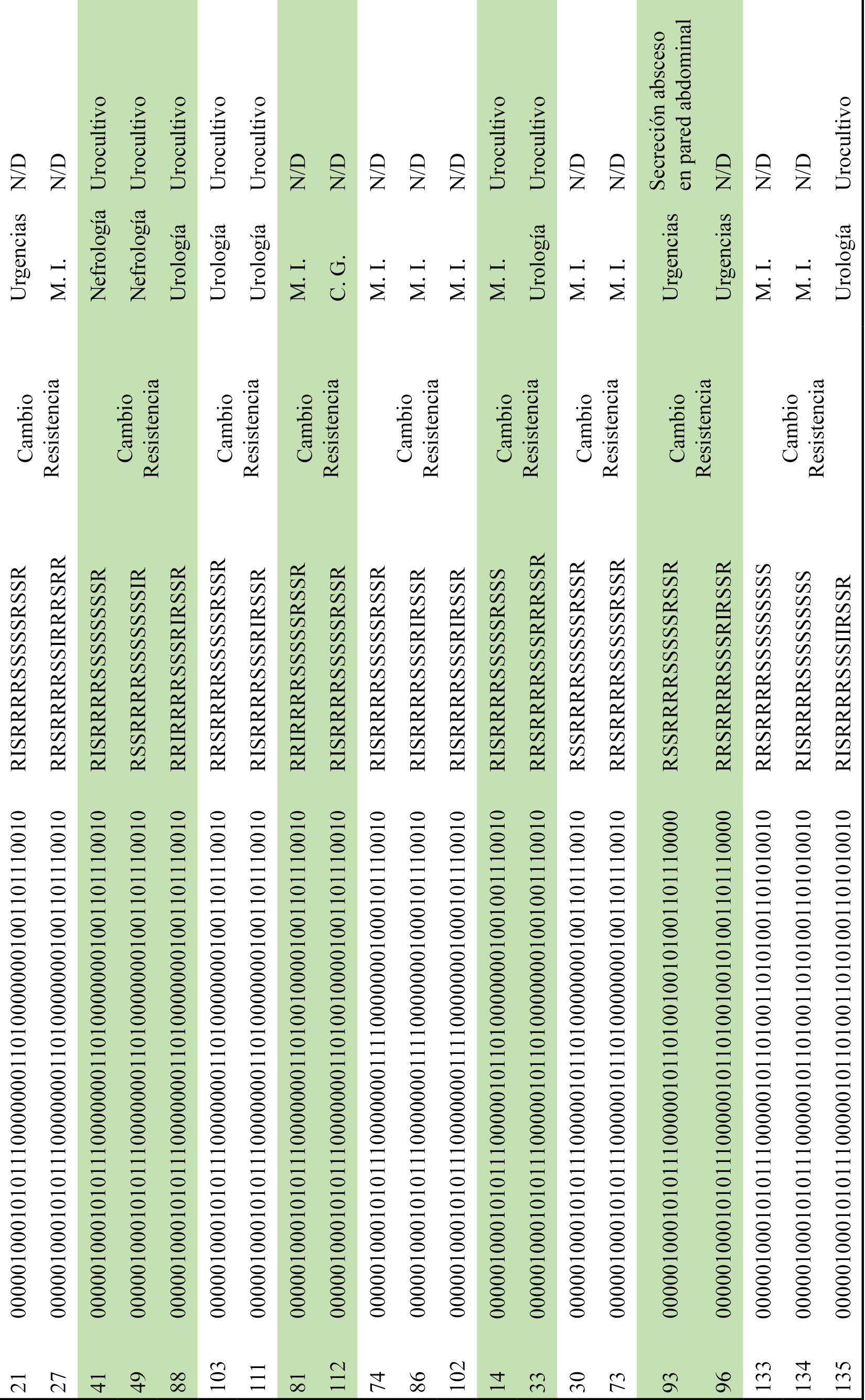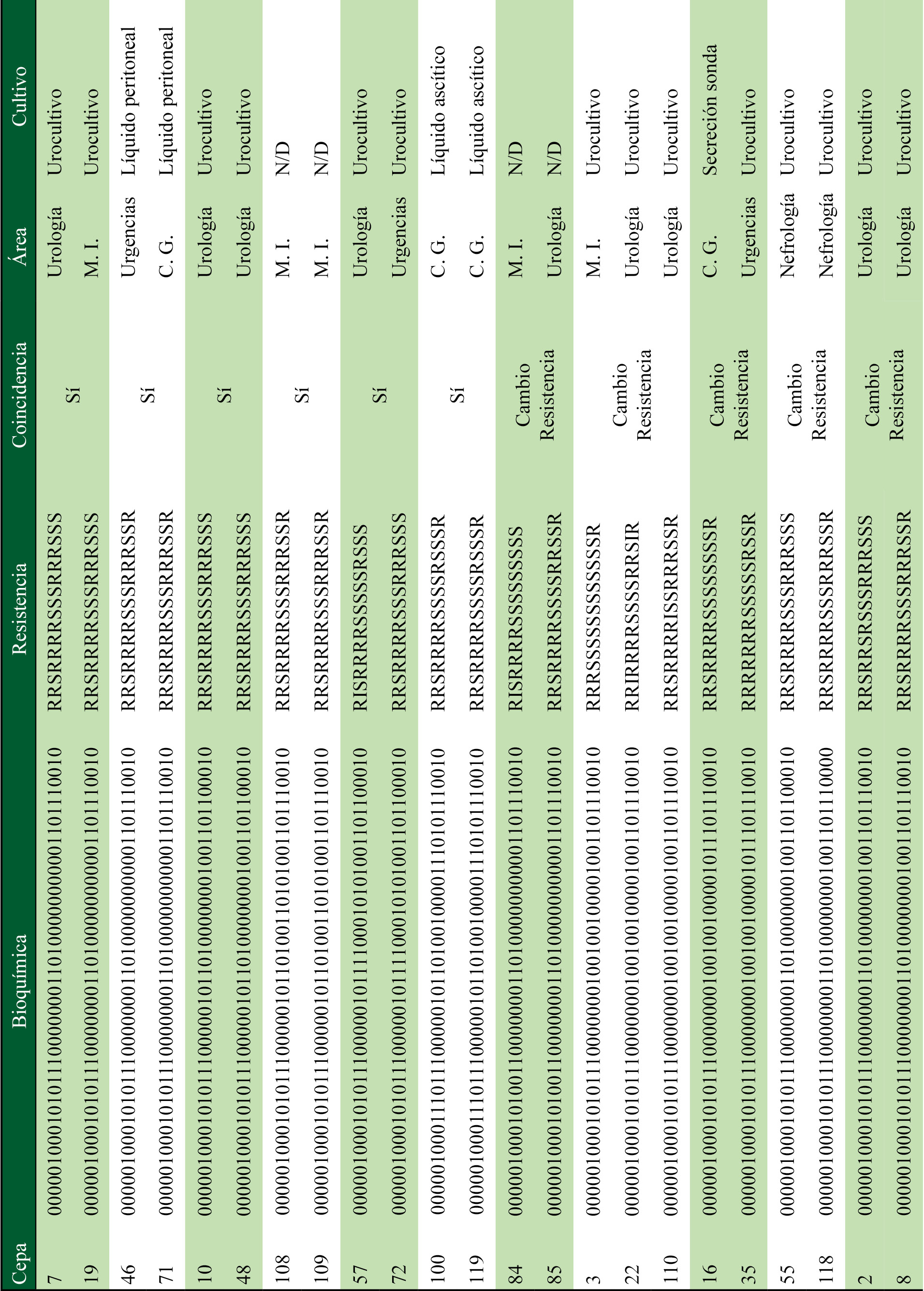 Por ello, en el cuadro 1 y en el anexo A se muestra que las cepas de E. coli son multirresistentes (BLEE) a diferentes antibióticos (penicilinas y cefalosporinas de tercera generación), además de sus pruebas bioquímicas (fenotípicas) pertinentes que ayudaron a comparar si existen variaciones entre ellas por medio de la asignación de dos códigos (el primero usando los antibiogramas y el segundo por sus pruebas bioquímicas) para precisar si existía diseminación de las cepas aisladas entre las áreas del Centro Médico, así como en qué áreas y de qué tipo de cultivo fueron aisladas las cepas para tener una relación de éstas que tuviesen una concordancia del código de bioquímicas con el de resistencia antibiótica (anexo A).