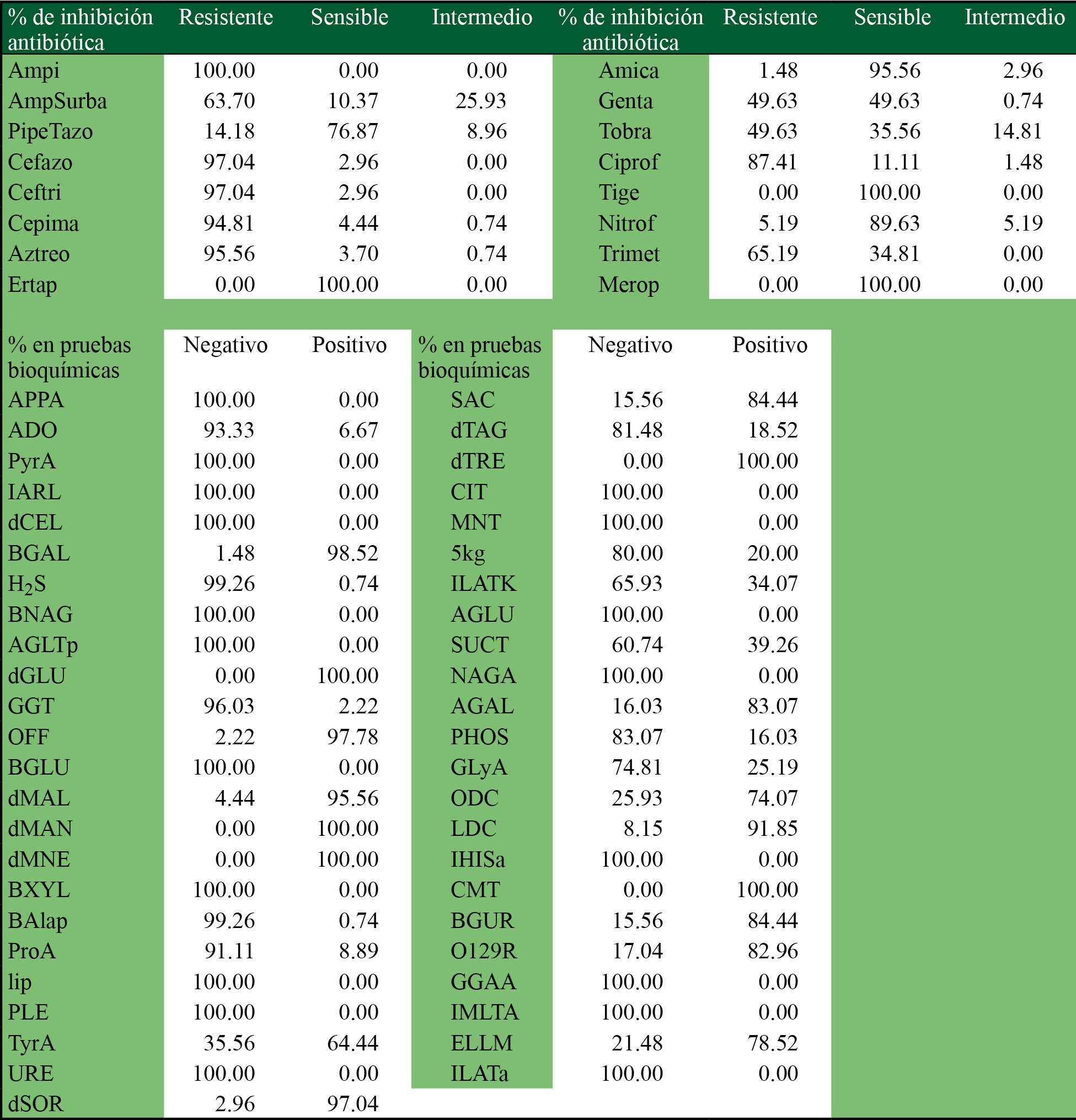 Los datos fueron identificados por el equipo VITEK®2 Compact (BioMérieux) teniendo insertos con las pruebas bioquímicas (APPA: Ala-Phe-Pro-arilamidasa, ADO: adonitol, PyrA: L-pirrolidonil-arilamidasa, IARL: L-arabitol, dCEL: D-celobiosa, BGAL: beta-galactosidasa, H2S: producción de H2S, BNAG: beta-N-acetil-glucosaminidasa, AGLTp: glutamilarilamidasapNA, dGLU: D-glucosa, GGT: gamma glutamiltransferasa, OFF: fermentación de glucosa, BGLU: beta glucosidasa, dMAL: D-maltosa, dMAN: D-manitol, dMNE: D-manosa, BXYL: beta xilosidasa, BAlap: beta alaninaarilamidasapNA, ProA: L-prolinaarilamidasa, lip: peroxidasa, PLE: palatinosa, TyrA: tirosina arilamidasa, URE: ureasa, dSOR: sorbitol, SAC: sacarosa, dTAG: D-tagatosa, dTRE: D-trealosa, CIT: citrato, MNT: malonato, 5KG: 5-ceto-D-gluconato, ILATK: alcalinización de L-lactato, AGLU: alfa glucosidasa, SUCT: alcalinización de succinato, NAGA: beta-N-acetil-galactosaminidasa, AGAL: alfa galactosidasa, PHOS: fosfatasa, GlyA: glicina arilamidasa, ODC: ornitina descarboxilasa, LDC: lisina descarboxilasa, IHISa: L-histidina, CMT: cumarato, BGUR: beta glucoronidasa, O129R: resistencia O/129 vibrio, GGAA: Glu-Gli-Argarilamidasa, IMLTa: L-malato, ELLM: Ellman, ILATa: L-lactato).