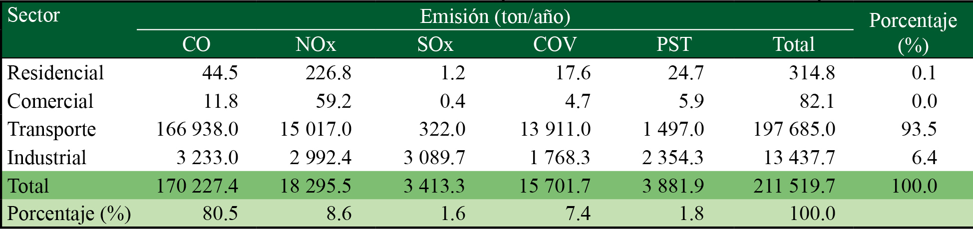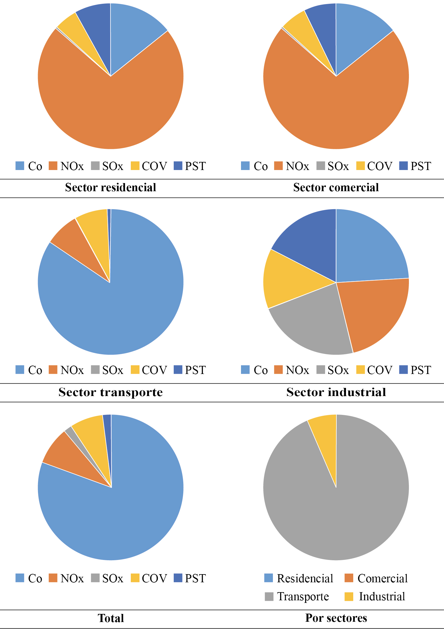 El cuadro 18 y la gráfica 1 muestran la emisión distribuida por sectores de contaminantes criterio en el Valle de Aburrá para 2015. El sector transporte aparece como el principal responsable de la emisión de contaminantes criterio en el Valle de Aburrá con un 93.5%, cantidad muy superior a la del sector industrial. La participación del sector transporte en la contaminación atmosférica indica en la actualidad una tendencia al aumento debido al alto crecimiento del parque automotor en los últimos años.