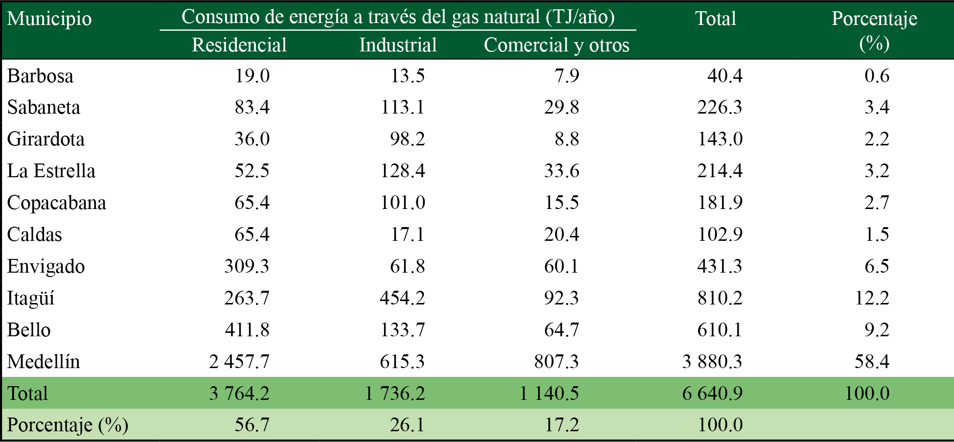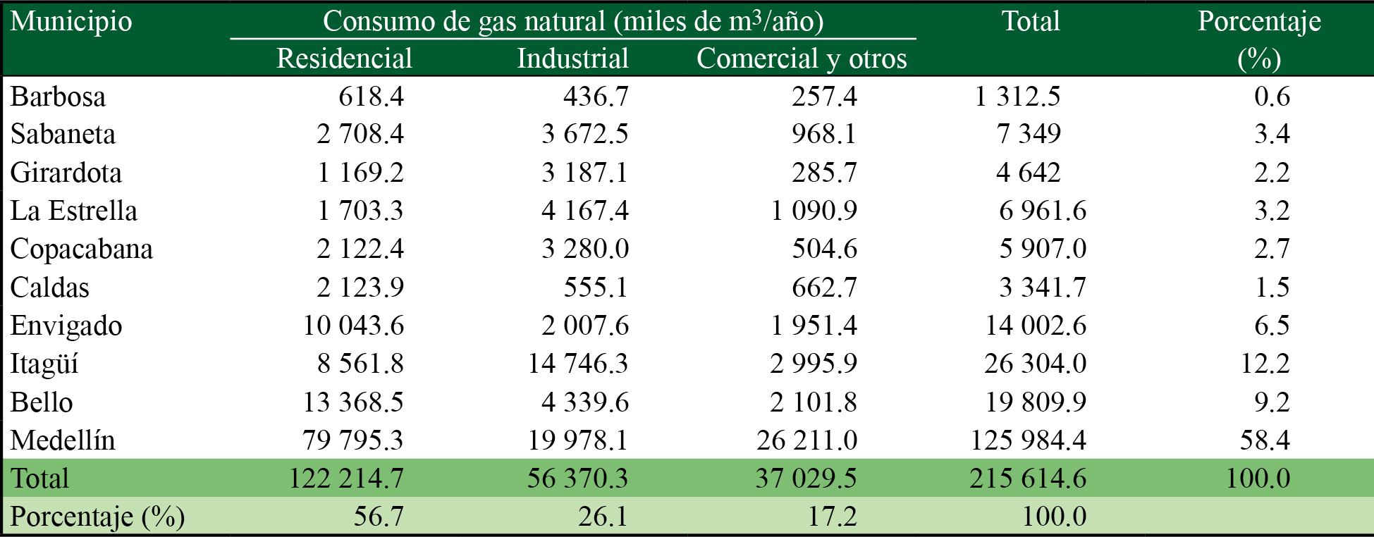El cuadro 5 muestra el consumo de gas natural en el Valle de Aburrá para 2015. El 56.7% del gas natural se usó en el sector residencial y el 26.1% en el sector industrial. Medellín es el municipio que más consumió gas natural (58.4%). El consumo de gas natural vehicular (GNV) para el sistema Metroplús durante 2015 fue de 3 698 953.24 m3, de los cuales el 64% fue consumido por los autobuses padrones y 36% restante por los autobuses articulados. En el sector comercial y otros del cuadro 5 se incluye el consumo de gas natural de los buses de Metroplús.