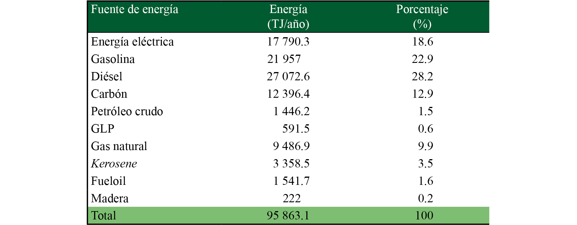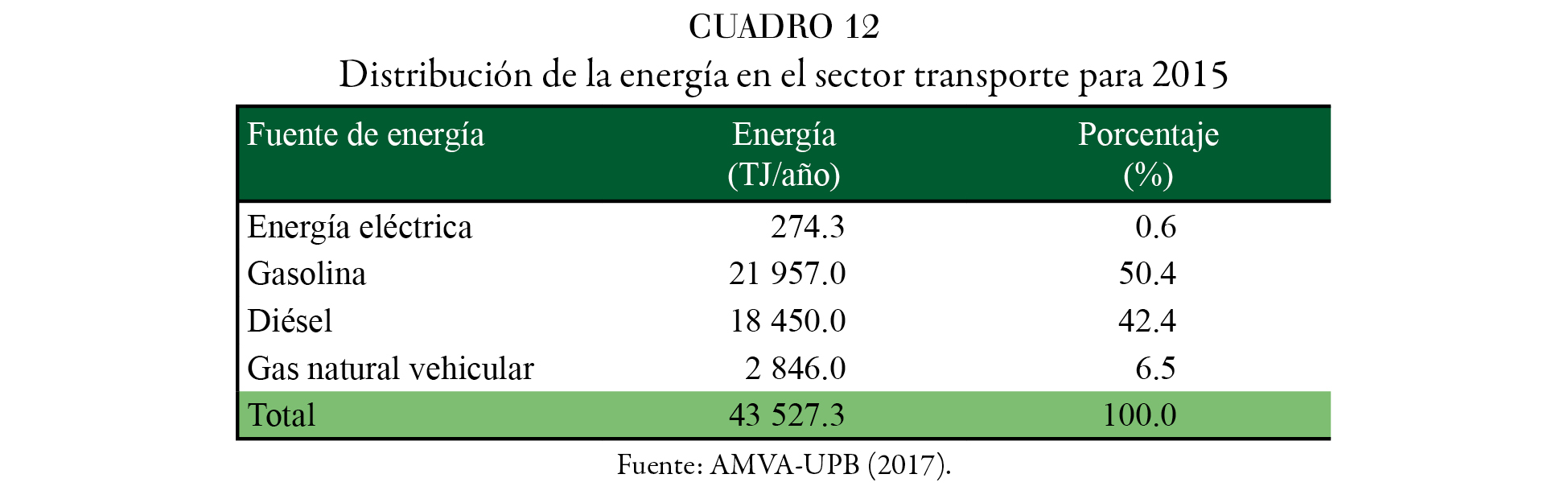 En el siguiente apartado se expone la composición de la canasta energética del Valle de Aburrá durante 2015 y las emisiones atmosféricas ocasionadas por el consumo de dichas fuentes de energía a partir de la aplicación de balances de materia y energía. La energía eléctrica, la gasolina, el diésel, el gas natural, el petróleo crudo y el carbón fueron las principales fuentes que alimentaron el sistema del Valle de Aburrá durante 2015. La energía que aportaron se distribuye en cuatro sectores: industrial, comercial, residencial y transporte.