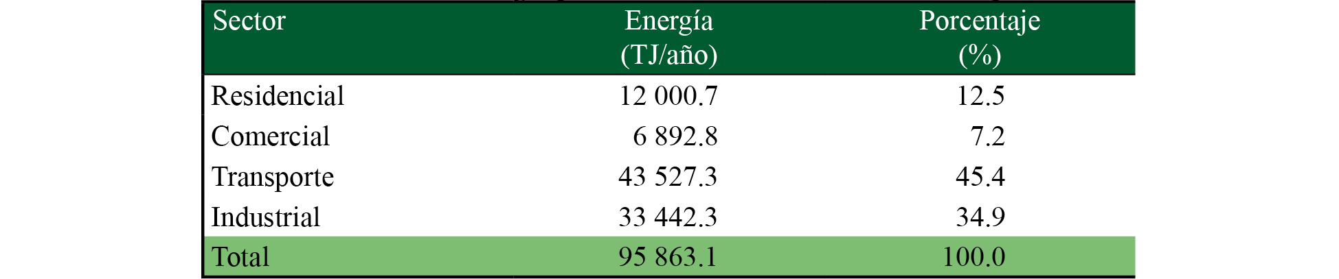 El cuadro 13 presenta la distribución en el uso de la energía para los sectores residencial, comercial, industrial y transporte en el Valle de Aburrá. En 2015 se consumieron 95 863.1 TJ en los diferentes sectores, donde los sectores transporte (45.4%) e industrial (34.9) fueron los que más demanda de energía tuvieron.
