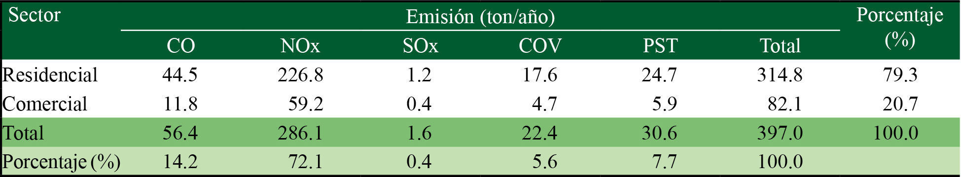 El cuadro 14 precisa la emisión de contaminantes criterio en los sectores residencial y comercial para 2015. La estimación de las emisiones a la atmósfera se hizo a través de factores de emisión de U.S. EPA (2017). La emisión de contaminantes en estos sectores se debió sobre todo al uso de gas natural.