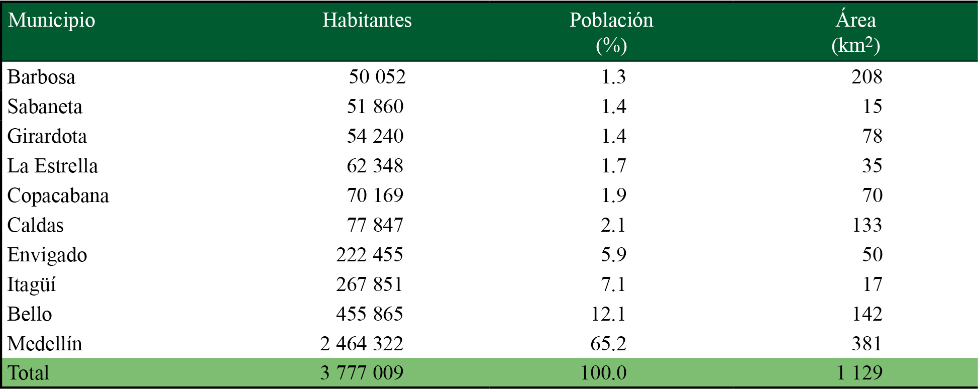 El Valle de Aburrá está conformado por diez municipios: Caldas, Sabaneta, La Estrella, Itagüí, Envigado, Medellín, Bello, Copacabana, Girardota y Barbosa. Tiene una extensión de 1 129 km2 de los cuales el 70% corresponde a zonas rurales y el 30% a zonas urbanas (DANE, 2017). De acuerdo con la proyección por parte del Departamento Administrativo Nacional de Estadística, para 2015 se reportan 3 866 165 habitantes, lo cual corresponde aproximadamente al 58% de la población del departamento de Antioquia (cuadro 1).