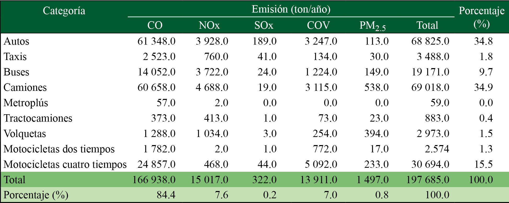 El cuadro 15 muestra la emisión de contaminantes criterio por categoría vehicular en el sector transporte para 2015. Se observa que los camiones son la principal fuente de NOx y PM2.5, pues suministran el 31% y 36% del total de las emisiones de estos contaminantes respectivamente. Se destaca también el aporte que realizan las volquetas a este último contaminante. A su vez, las emisiones de compuestos orgánicos volátiles (COV) son dominadas por las motocicletas de cuatro tiempos con un 37%, mientras que los automóviles son las principales fuentes de emisión de CO y SOx (contribuyen con el 37% y 59% respectivamente) debido a su número y a que la mayoría recurre a la gasolina como combustible, la cual tiene un porcentaje más elevado de azufre que el diésel (AMVA-UPB, 2017).
