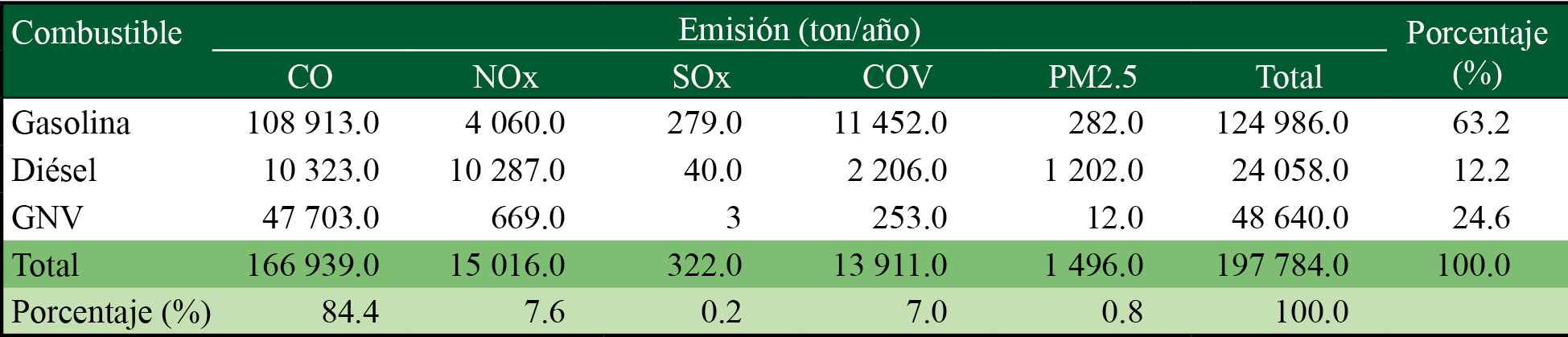 Las emisiones por tipo de combustible se encuentran en el cuadro 16. Se observa que la gasolina es la principal fuente responsable de las emisiones de CO, SOx y COV, con un 65%, 87% y 82% respectivamente. El diésel es la principal fuente de NOx y PM2.5 con un 69% y 80% de las emisiones de estos contaminantes. El GNV por su parte hace una contribución clave a las emisiones de CO con un 29% (AMVA-UPB, 2017).