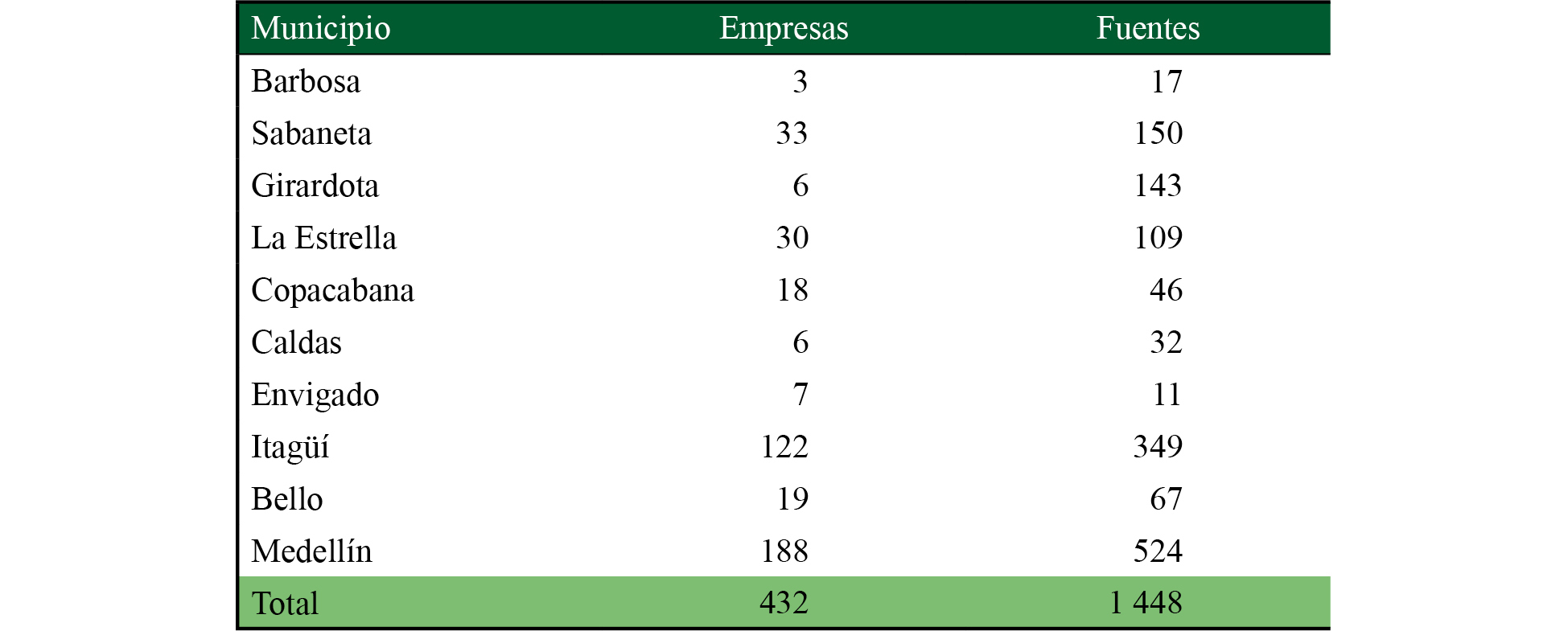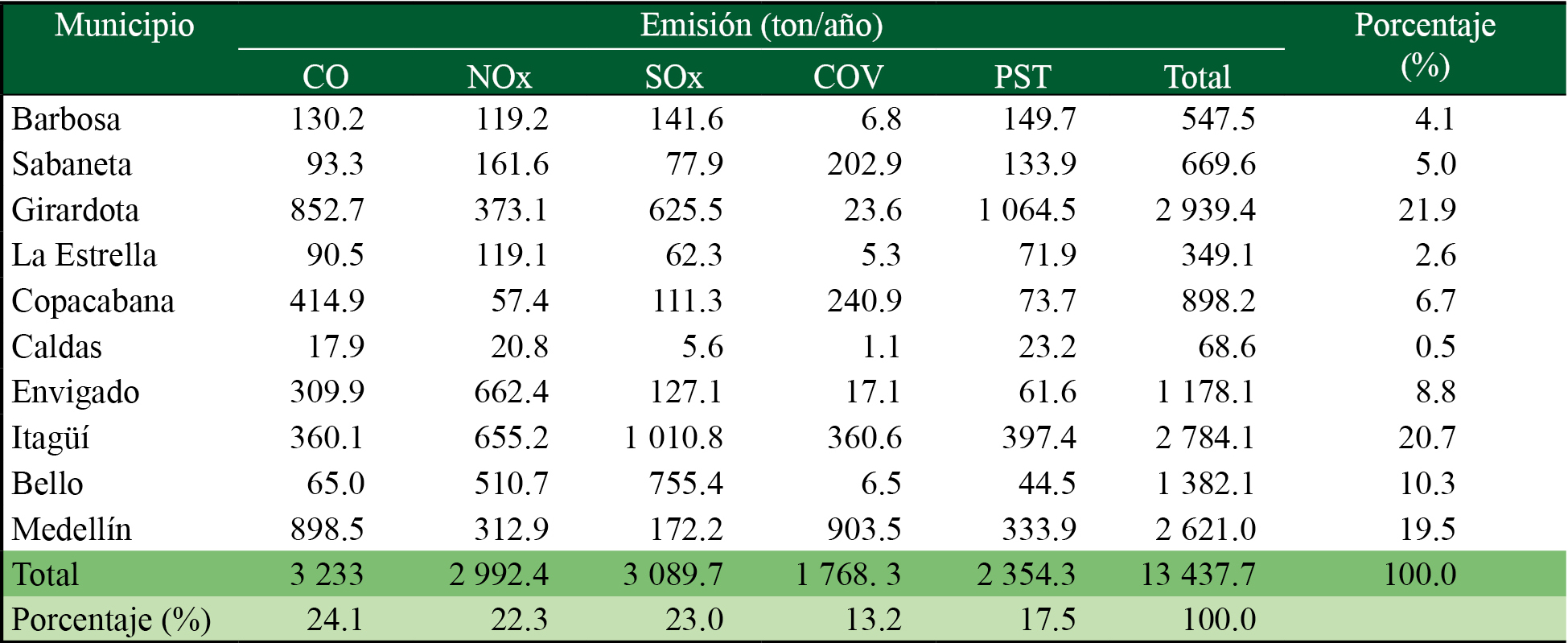 En 2015 el Valle de Aburrá contaba con 432 empresas que emitían contaminantes a la atmósfera y que tenían 1 448 fuentes de emisión (cuadro 3). Se observa que en Medellín e Itagüí se encontraban el 72% de las empresas y el 60% de las fuentes de emisión. Las demás empresas y fuentes se distribuyen en los ocho municipios restantes, donde se destaca que las seis empresas que se encontraban ubicadas en Girardota contaban con 143 fuentes de emisión (AMVA-UPB, 2017).