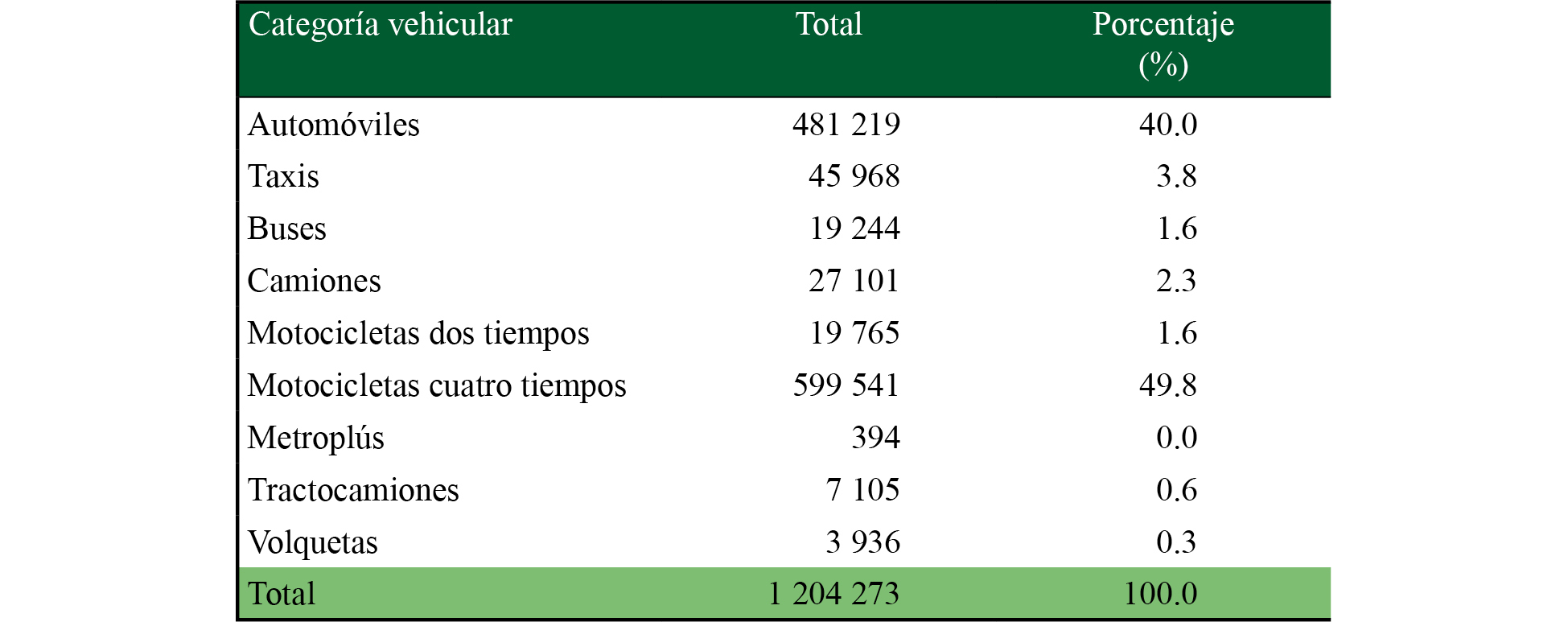 De acuerdo con los datos proporcionados por la Secretaría de Tránsito y Transporte de los diferentes municipios del Valle de Aburrá, en 2015 el parque automotor estaba conformado por 1 204 273 vehículos, de los cuales la mayoría son motocicletas y automóviles (cuadro 2) (AMVA-UPB, 2017).