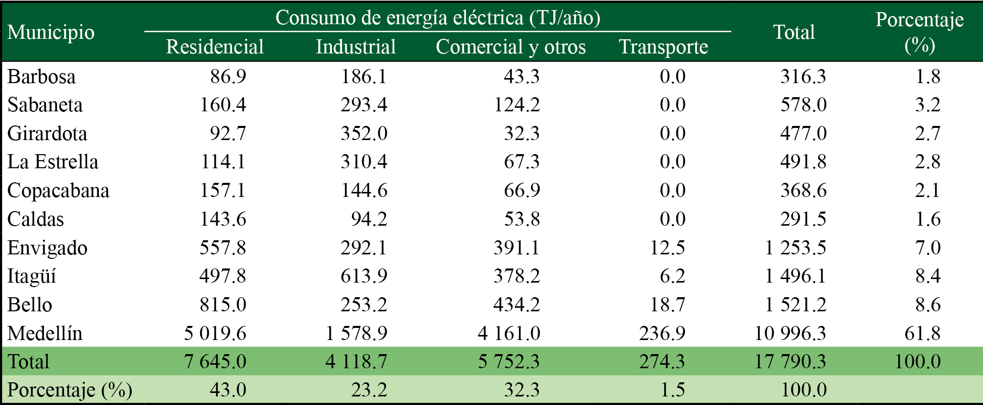 El consumo de energía eléctrica en el Valle de Aburrá para 2015 fue de 17 790.3 TJ. El 43% de la energía eléctrica se usó en el sector residencial y el 23.2% en el sector industrial. Medellín, debido a su extensión y población, utilizó el 61.8% del total de la energía eléctrica consumida en el Valle de Aburrá en 2015 (cuadro 4).