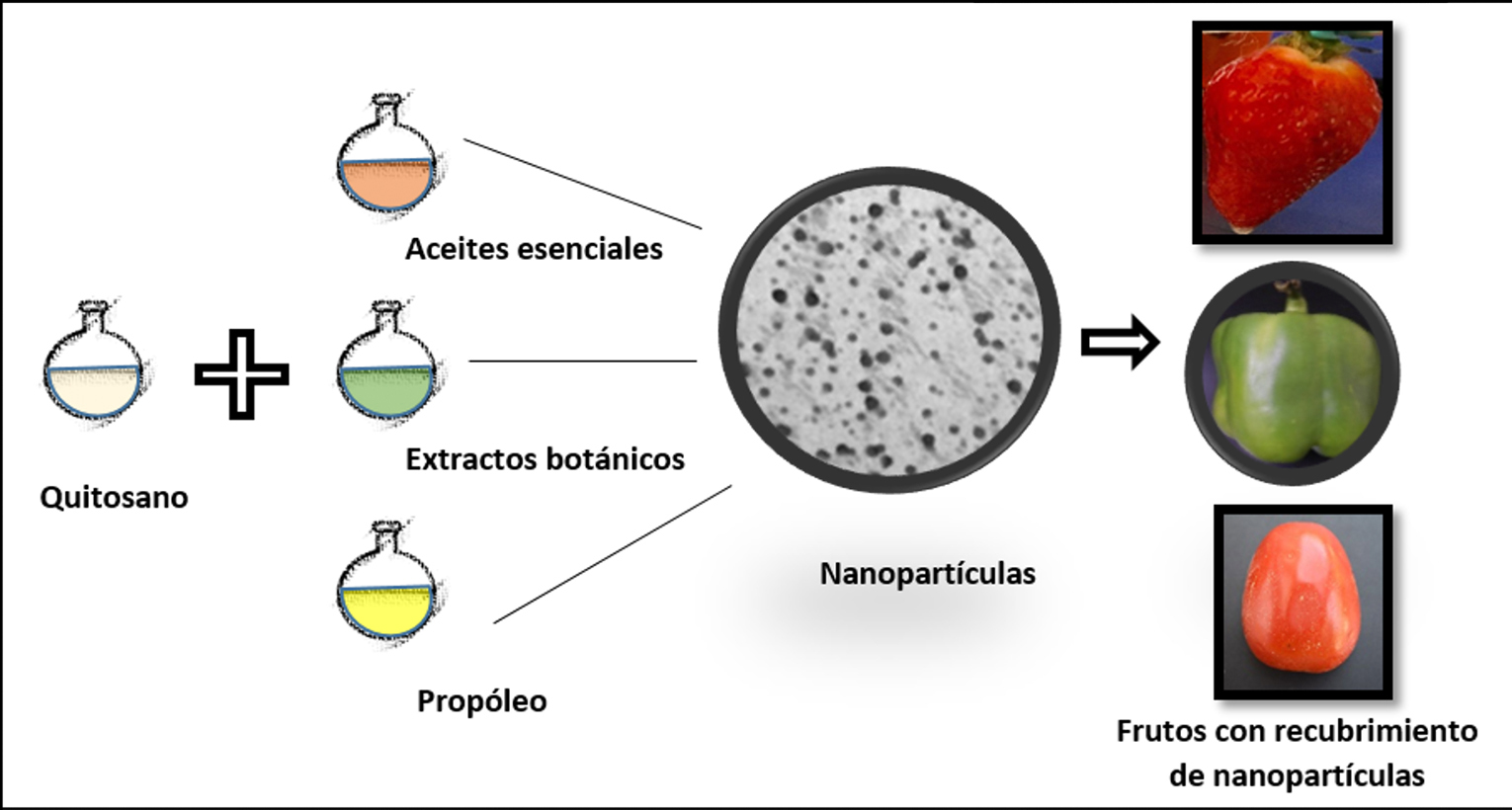En la figura 1 se muestra la aplicación de recubrimientos con nanopartículas de quitosano y agentes naturales para la conservación de productos hortofrutícolas (fresa, jitomate y pimiento morrón).