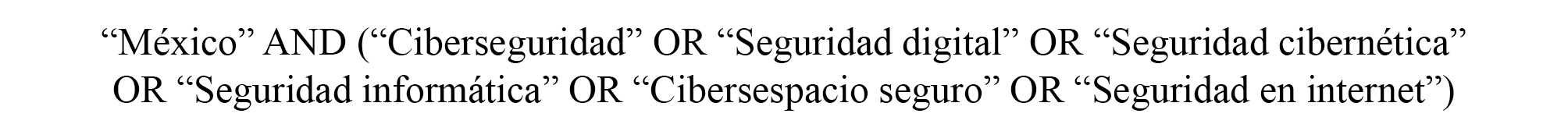 Los términos de búsqueda considerados con la misma configuración en cada uno de los buscadores son los siguientes: ciberseguridad, seguridad cibernética, seguridad informática, ciberespacio seguro y seguridad en internet. Todos ellos se combinaron con la palabra México. De acuerdo a lo anterior, la ecuación 1 muestra la fórmula de búsqueda empleada: