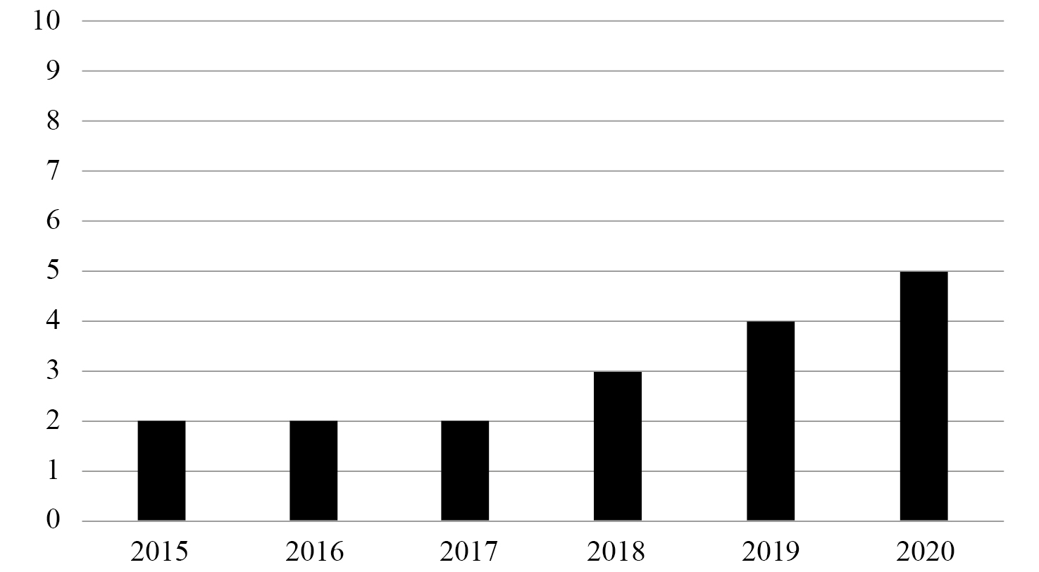 La gráfica 1 muestra el avance cronológico de las publicaciones durante el periodo seleccionado. De los 18 artículos encontrados en la búsqueda, se puede registrar que la producción máxima por año fue en 2020 con un total de cinco documentos, mientras que en 2019 se publicaron cuatro trabajos, en 2018 la cifra fue de tres y en el periodo 2015-2017 la cantidad de artículos por cada año fue de dos solamente. Estos resultados sugieren que los investigadores han estado incluyendo cada vez más el tema de la ciberseguridad en sus publicaciones.