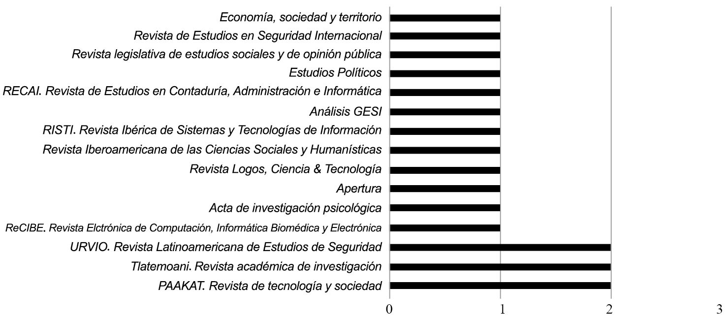 También, muestra que en el periodo considerado URVIO. Revista Latinoamericana de Estudios de Seguridad, Tlatemoani. Revista académica de investigación y PAAKAT. Revista de tecnología y sociedad son las que cuentan con mayor cantidad de artículos referentes a este tema. Lo anterior es acorde con las temáticas definidas en cada uno de estos ejemplares, entre las cuales se encuentra la tecnología y la seguridad en relación con otras disciplinas y aspectos socioculturales.