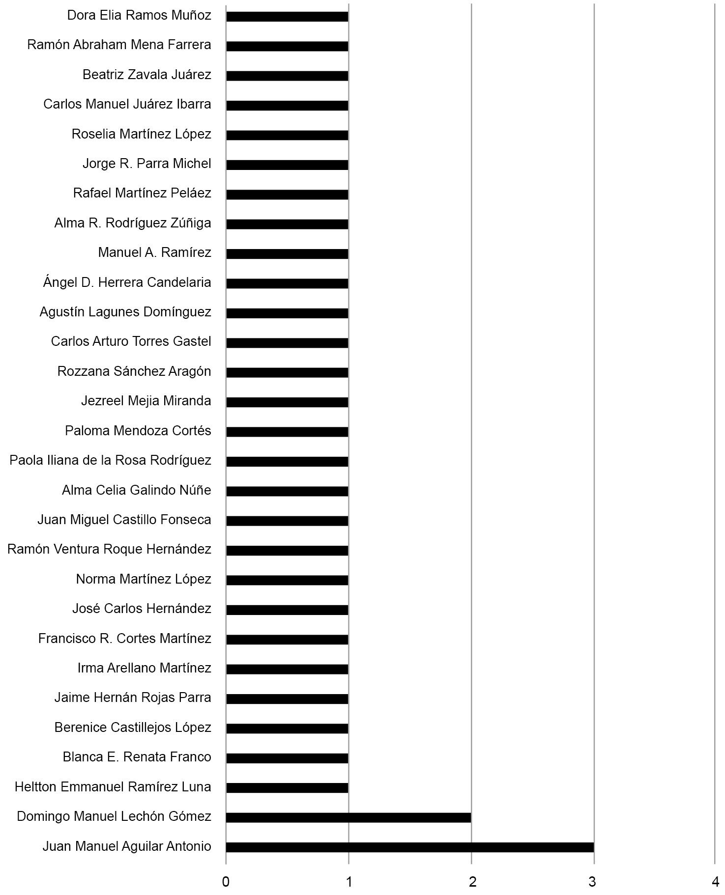 El resto de los investigadores cuenta sólo con una publicación bajo su nombre; no obstante, es necesario apuntar que dentro de los trabajos se señala como autor primario o único a los autores de la posición 15 a la posición 29 en la gráfica 3, mientras que los creadores de la ubicación 1 a la ubicación 14 se han identificado como coautores de sus respectivos artículos.