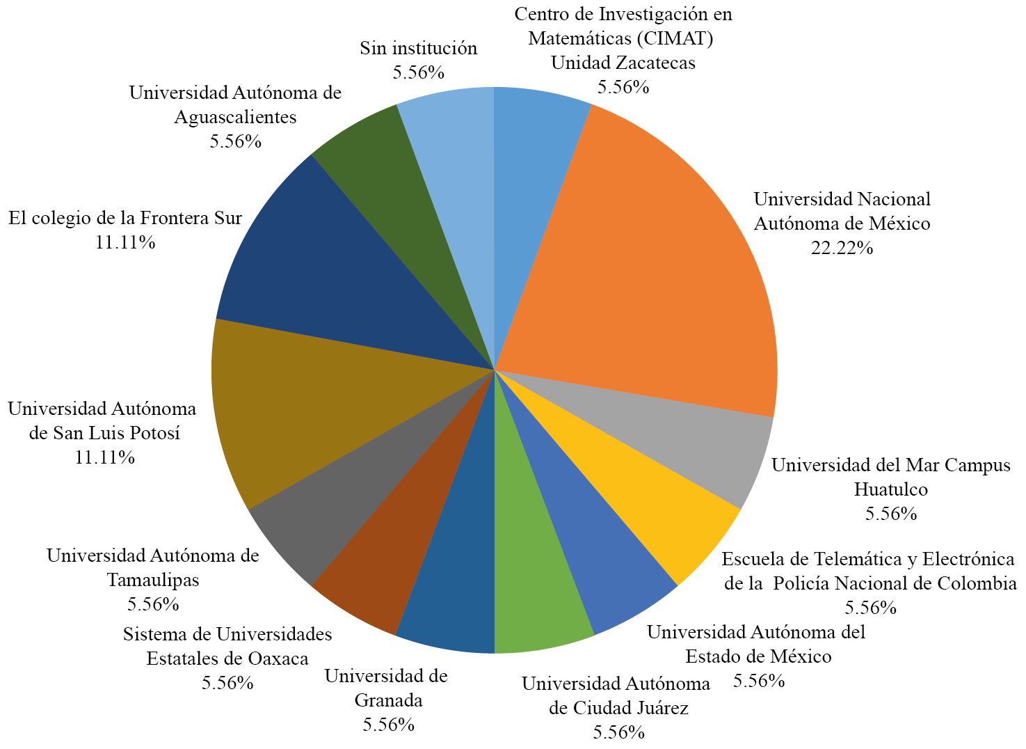 Además, permite observar que Juan Manuel Aguilar Antonio es quien cuenta con mayor productividad; sin embargo, ya que es el único autor de sus escritos, no se logra identificar la existencia de “colegios invisibles” dedicados a la investigación de México en temas de ciberseguridad. Por otra parte, dado el número de trabajos a su nombre, cuya afiliación institucional (al momento del análisis) es la Universidad Nacional Autónoma de México, coloca a este organismo como la institución con mayor cantidad de artículos publicados.