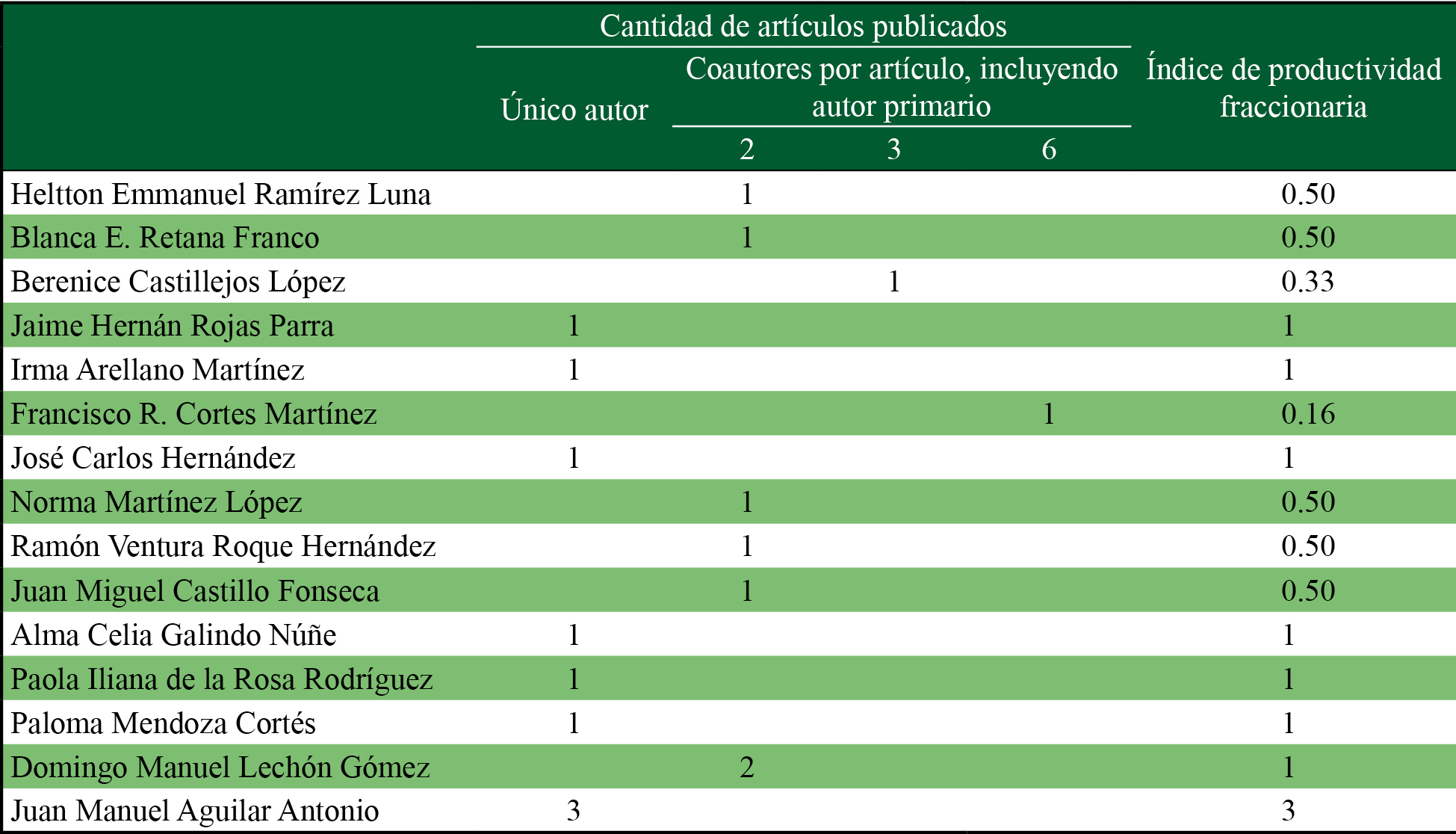 El resto de los autores listados dentro del cuadro 1 pertenece a la clasificación “grandes productores”. Sin embargo, cabe destacar que el autor Juan Manuel Aguilar Antonio es el único que cuenta con un índice de productividad fraccionaria mayor a 1 dentro de esta clasificación debido a que sus tres trabajos publicados son solamente de su autoría.