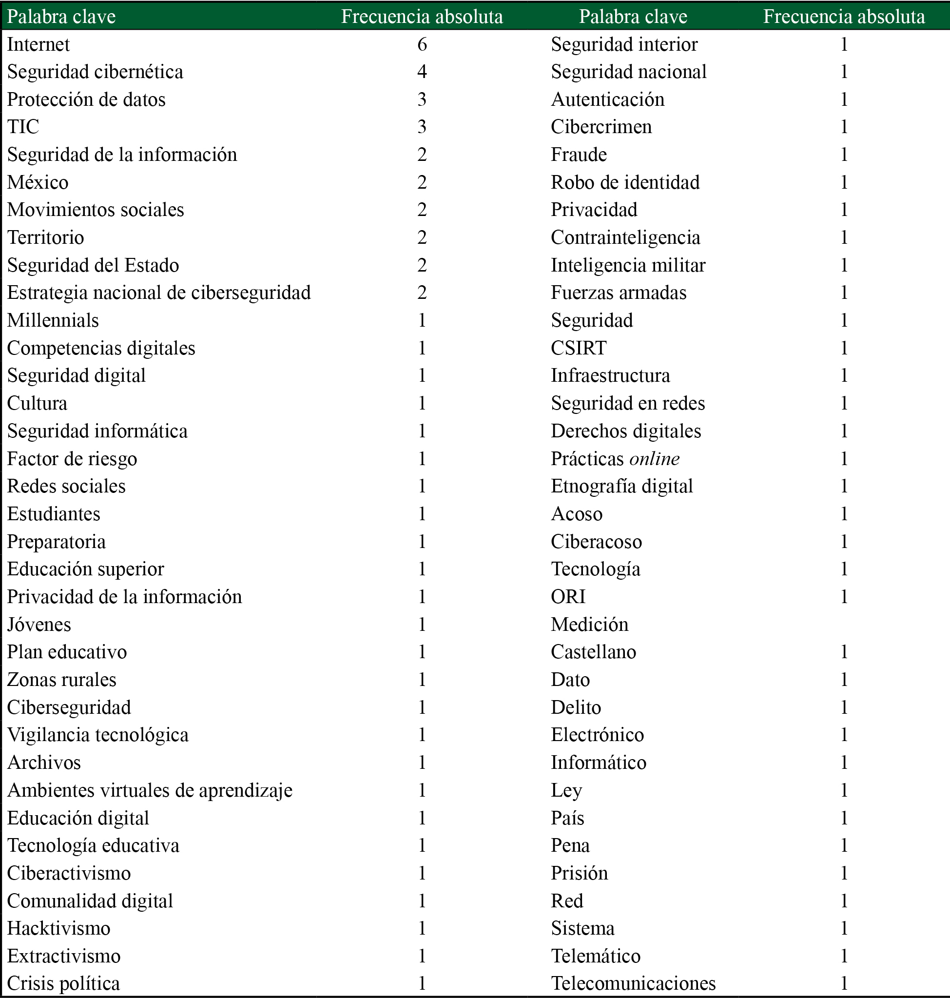 En el cuadro 2 se encuentra el listado de todas las palabras clave diferentes identificadas durante el análisis, con un total de 70. Las que tienen mayor frecuencia absoluta son “Internet” y “Seguridad cibernética”, con seis y cuatro apariciones respectivamente; la tercera posición es ocupada por “TIC” y “Protección de datos” con un valor de tres cada una de ellas, mientras que “Seguridad de la información”, “México”, “Movimientos sociales”, “Territorio”, “Seguridad del Estado y “Estrategia nacional de ciberseguridad” tienen una frecuencia absoluta de dos cada una; las restantes aparecen sólo una vez.