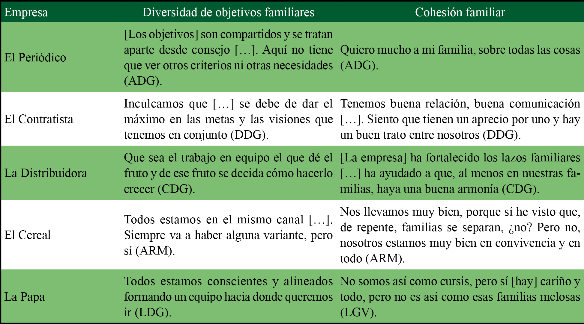 La tabla 7 concentra pasajes de las entrevistas relacionados con la diversidad de objetivos familiares y la cohesión familiar, los cuales permitieron registrar en todas las organizaciones niveles bajos para la primera variable y altos en la segunda.
