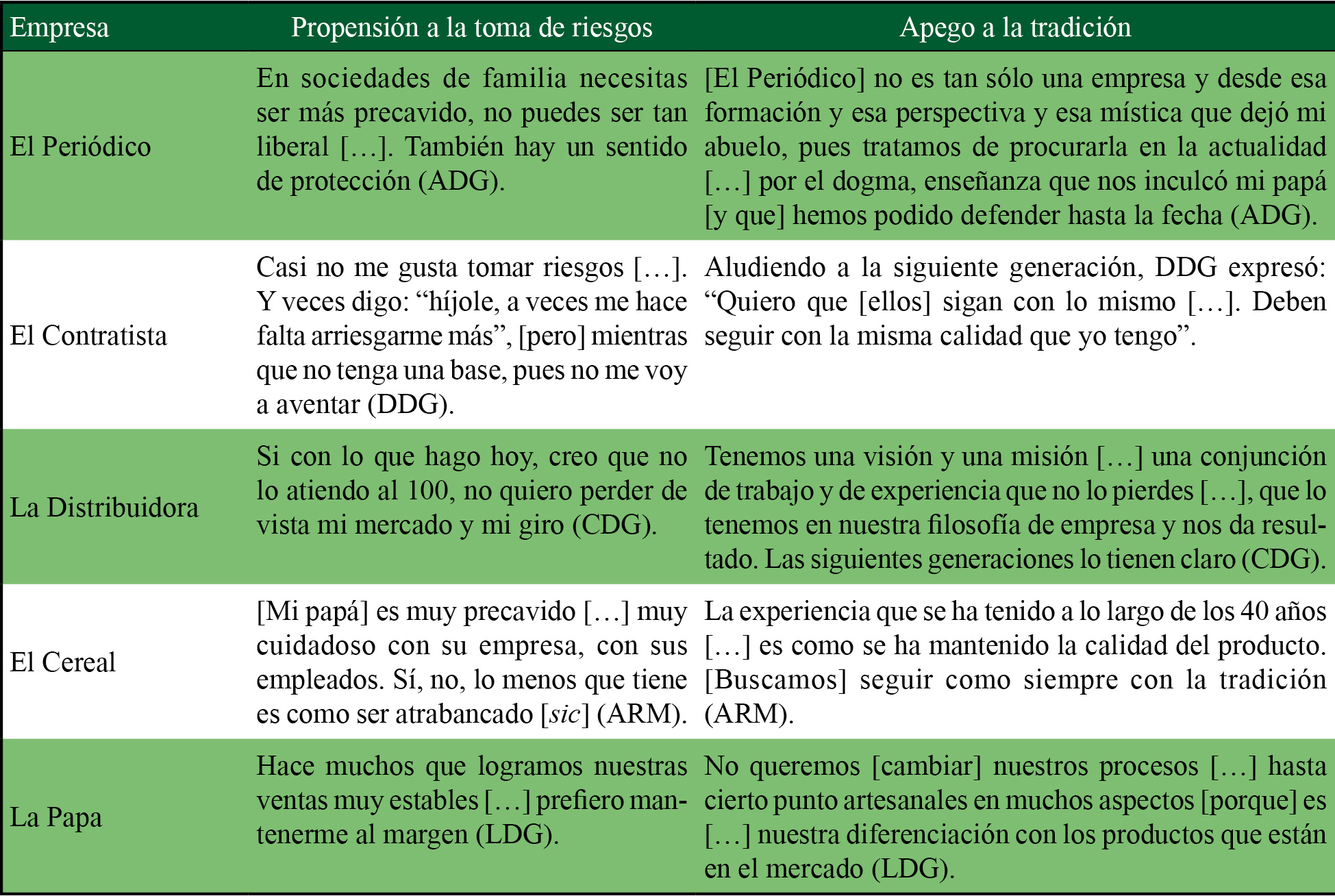 La tabla 8 agrupa fragmentos referentes a la toma de riesgos y el apego a la tradición, los cuales sirvieron para identificar niveles bajos y altos en todos los negocios.