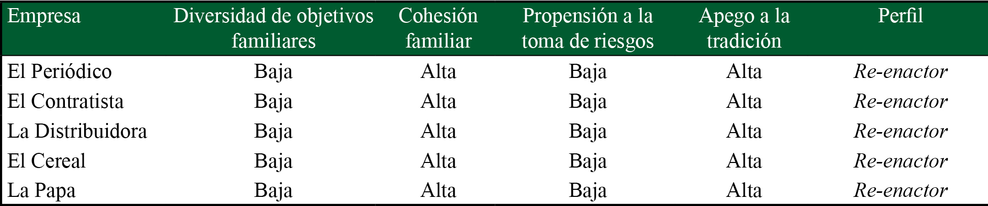 Del mismo modo, las dimensiones analizadas para la postura innovadora de la empresa familiar coincidieron en niveles altos y bajos en todas las entidades participantes, lo que empata con el perfil de re-enactor. Por tanto, una vez que se rechazaron otros perfiles también posibles (seasoner, digger y adventurer), después de un riguroso análisis de la información, se encontró empíricamente lo planteado por Rondi et al. (2018), lo que dio pie a generalizar, desde un punto de vista analítico, los resultados obtenidos al basarse en dicha construcción teórica.