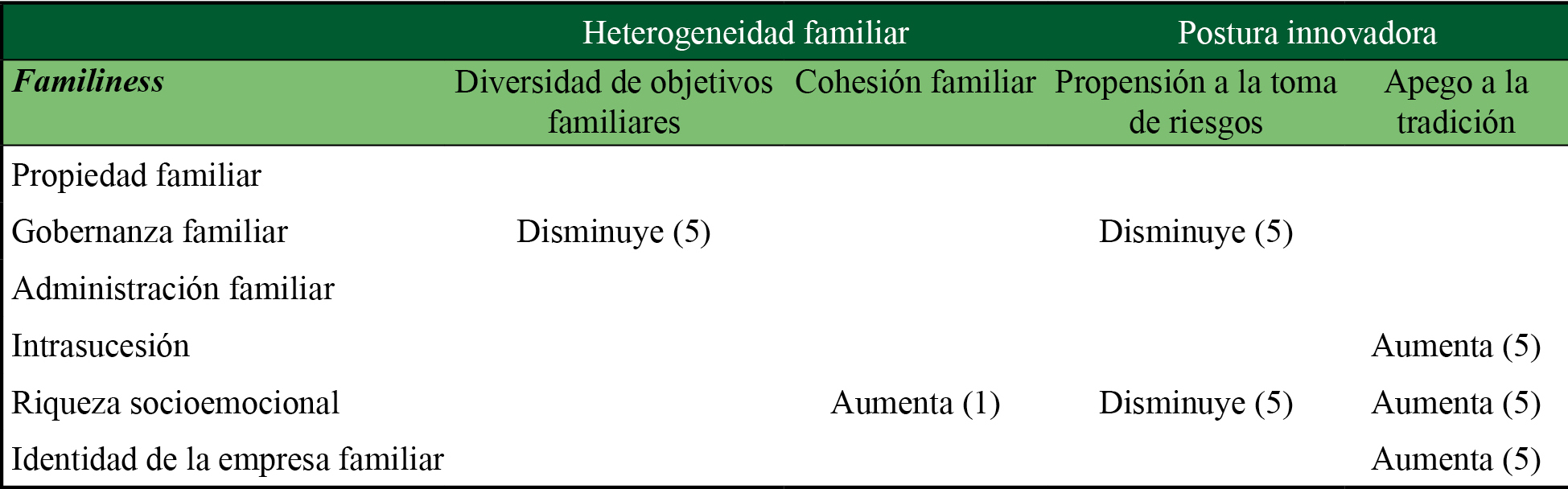 En esta línea, de acuerdo con Habbershon et al. (2003), la tendencia para innovar de las EF puede hallarse asociada a su familiness particular; no obstante, el estudio de su influencia aún es muy limitado (López et al., 2012). A su vez, Frank et al. (2017) señalan que dicho constructo puede tener efectos diversos en la innovación, argumento respaldado en la literatura a partir de algunos de sus componentes, a diferencia de este escrito en donde se hace una consideración más amplia del mismo.