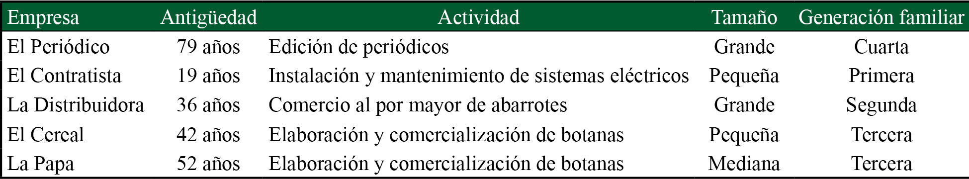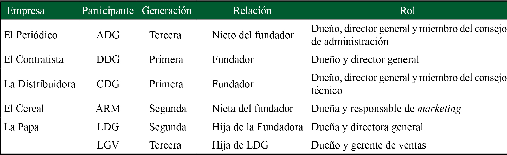 Ahora bien, los informantes clave en todos los casos fueron socios propietarios. En cuatro de ellos, sus directores generales, a excepción de El Cereal, donde participó la hija del director y responsable del área de marketing. En La Papa contribuyó la gerente de ventas e hija de la directora. En las empresas de primera y segunda generación tomaron parte los fundadores. En las de tercera generación colaboró la nieta del fundador de El Cereal. En el caso de La Papa intervino la hija y una nieta de los iniciadores. En la cuarta generación de El Periódico colaboró un nieto del fundador.
