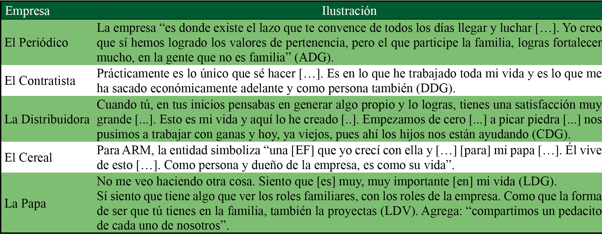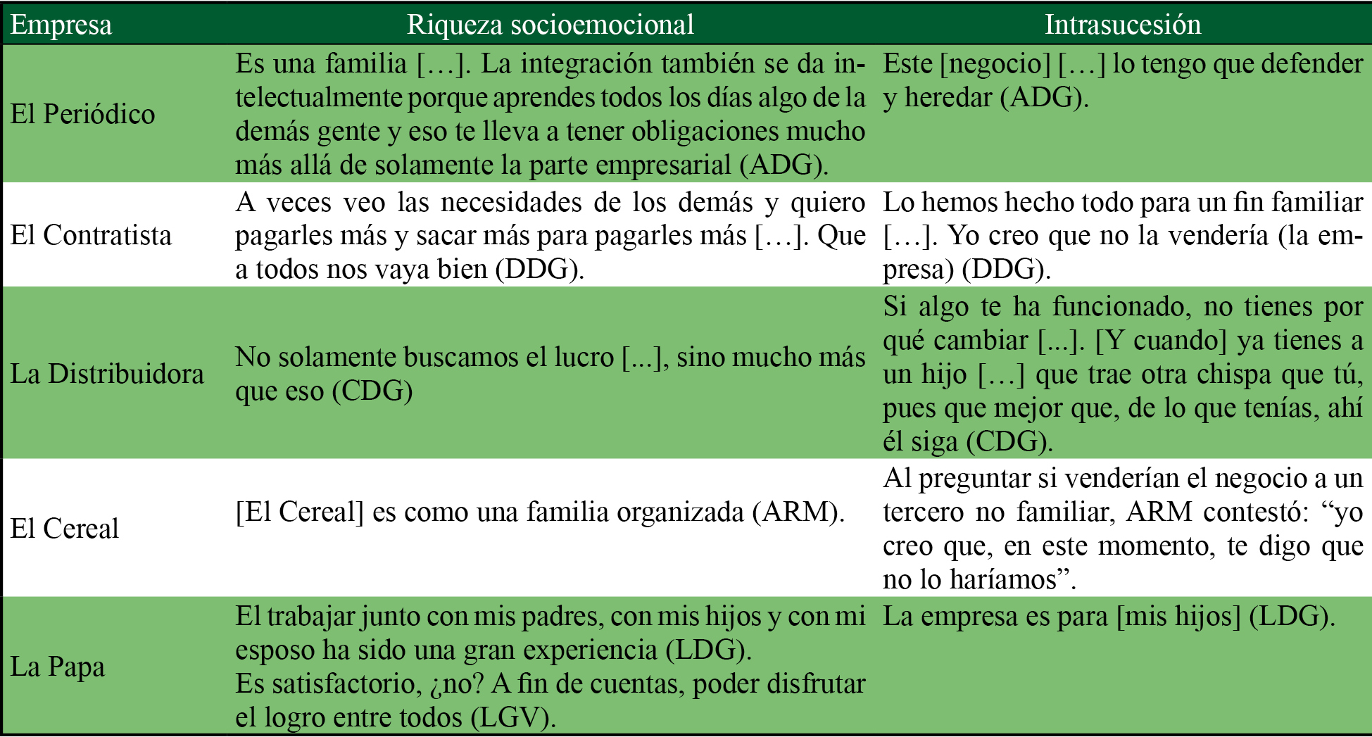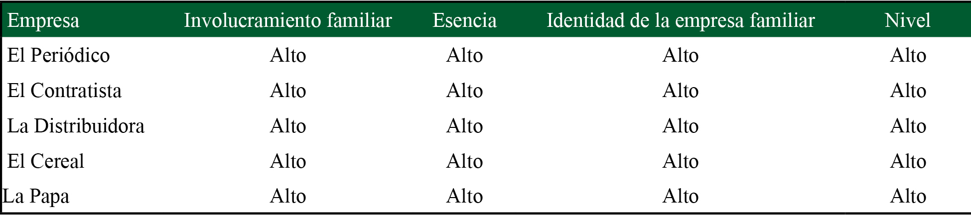 La tabla 4 contiene lo relacionado a la esencia, es decir, la riqueza socioemocional y la intrasucesión con extractos ilustrativos de las entrevistas que muestran el valor emocional transferido a la entidad y la intención de mantener a la empresa en manos familiares. Sobresale que el nivel de esencia determinado para todas las organizaciones es alto.