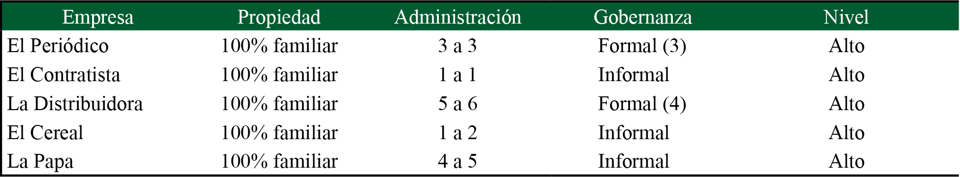 En este apartado se muestran los niveles establecidos para las dimensiones de la familiness. La tabla 3 sintetiza el involucramiento familiar especificando el nivel para cada empresa a partir de la propiedad (porcentaje en manos de la familia), administración (razón de puestos directivos ocupados por miembros de la familia a puestos directivos totales) y gobernanza familiares (si existen órganos formales de gobierno corporativo y, de ser así, el número de miembros de la familia participes entre paréntesis).