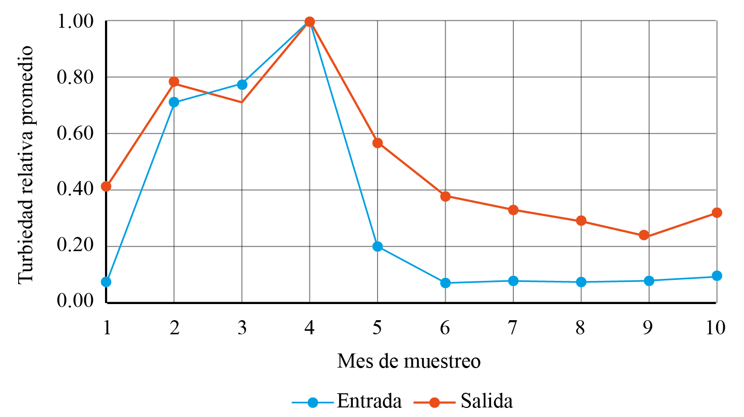 En el cuadro 2 se presentan los resultados obtenidos para la turbiedad del agua de la planta Guarumo, mientras que en la gráfica 1 la variación relativa promedio de la turbiedad en la planta entre enero y octubre de 2018. Estos valores se obtuvieron al dividir el valor de la turbiedad entre el valor mayor para la situación considerada (entrada o salida).
