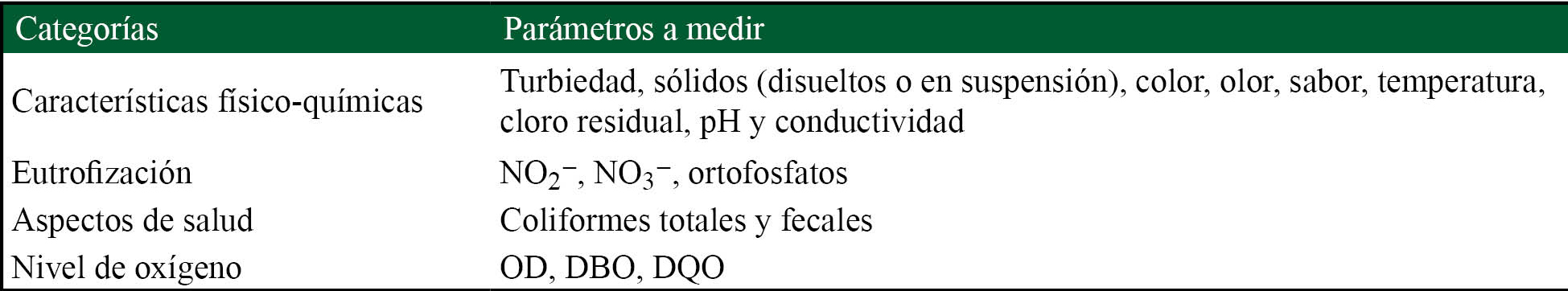 La selección de los parámetros se agrupa en cuatro categorías: a) Las características fisicoquímicas del agua, en cuyo caso se evalúa la turbiedad, los sólidos (disueltos o en suspensión), el color, el olor, el sabor, la temperatura y el pH. b) La eutrofización, el cual es un proceso natural o antropogénico que consiste en el enriquecimiento de las aguas con nutrientes, nitratos y fosfatos; en este caso se miden las concentraciones de nitritos, nitratos, y compuestos del fósforo (P), entre ellos los ortofosfatos. c) Los aspectos de salud, los cuales se analizan por la presencia (o ausencia) de coliformes totales y fecales. d) El nivel de oxígeno en cuyo caso los parámetros que se miden son la demanda de oxígeno (DO), la demanda bioquímica de oxígeno (DBO) y la demanda química de oxígeno (DQO) (tabla 1).