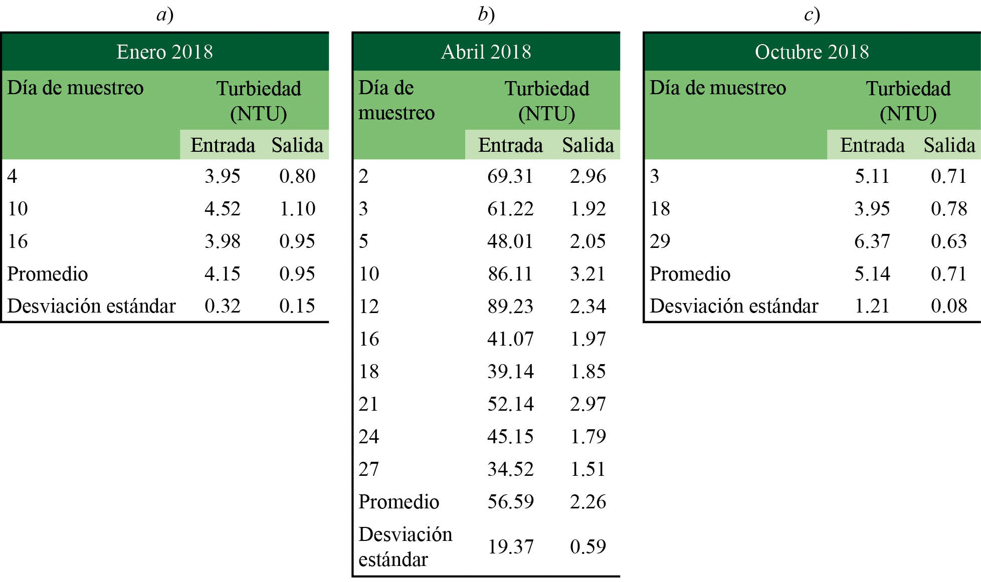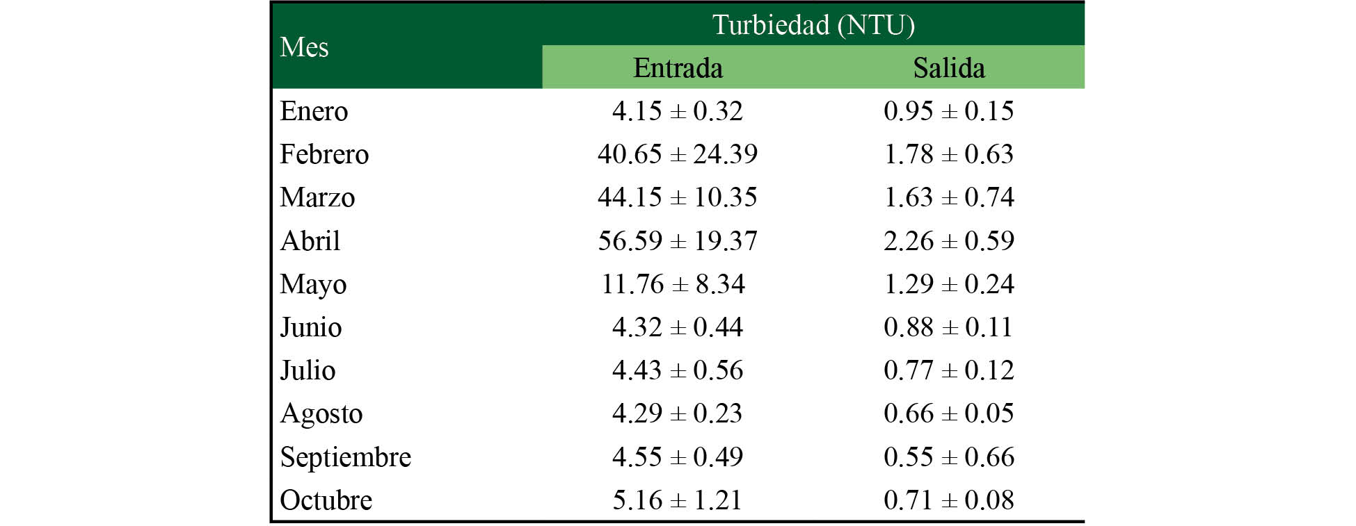 En el cuadro 1 se muestran los valores obtenidos para la turbiedad en enero, abril y octubre de 2018. De acuerdo con los resultados, los valores de turbiedad a la entrada de la planta son superiores a los de salida; en el caso de abril, esta diferencia es muy notable.