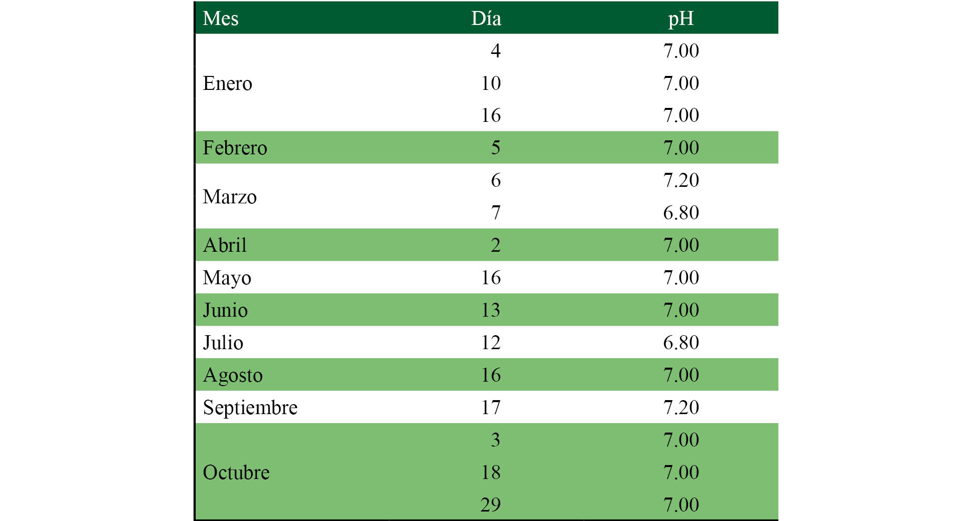 En el cuadro 3 se concentran los valores obtenidos para el pH del agua de la planta potabilizadora de Guarumo. Aunque el pH no suele afectar de manera directa a los consumidores, es uno de los parámetros operativos más imprescindibles de la calidad del agua (OMS, 2011). Valores de pH iguales o superiores a 6.5 son los que se recomiendan en el agua potable para prevenir la corrosión (Oyem et al. 2014). Valores de pH por arriba de 8.0 hacen que los métodos de tratamiento y desinfección con cloro no sean tan eficaces (OMS, 2011). Así, los valores de pH comprendidos entre 6.5 y 8.5 son los que se consideran indicadores de buena calidad del agua. De acuerdo con el cuadro 3, los valores obtenidos para el pH (promedio 7) están entre estos valores, lo cual garantiza también conseguir mayor desinfección del agua con una menor dosificación de desinfectante (Lahora et al., 2019).