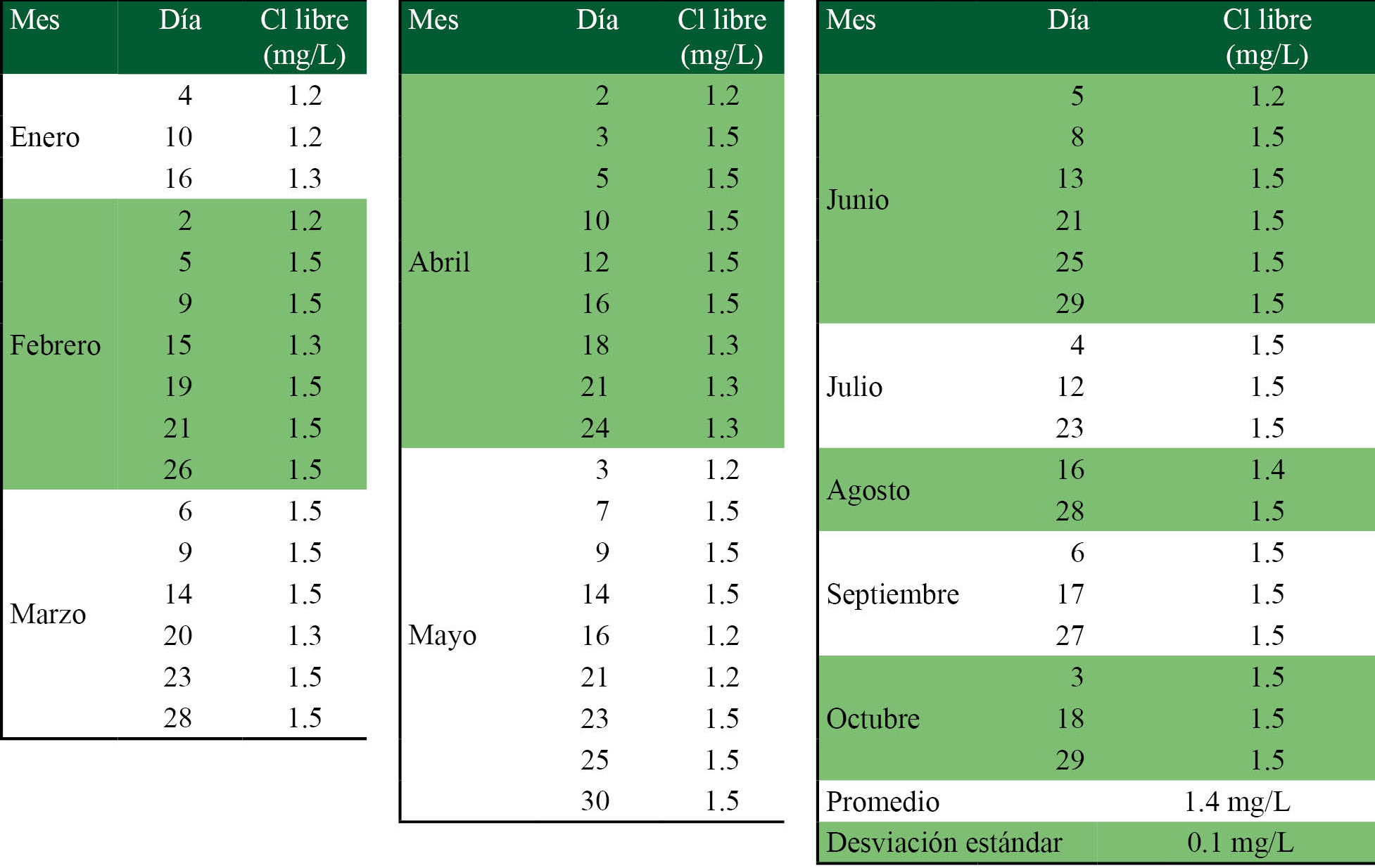 Como se observa, todos los valores del cloro libre medidos se encuentran entre 1.2 y 1.5 mg/l (promedio 1.4 mg/l); estos valores están comprendidos en el intervalo 0.3-1.5 mg/l establecidos en la Norma Técnica Ecuatoriana del INEN (2011) como cantidad de cloro libre que debe cumplir el agua potable.