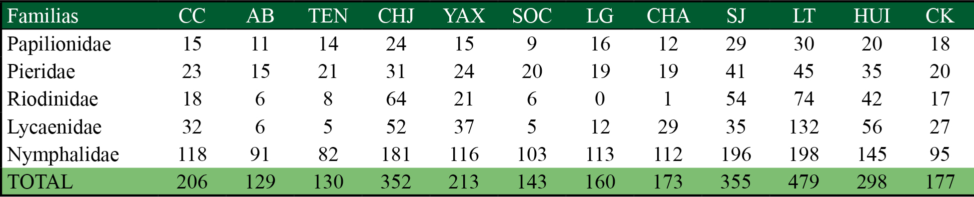 Flores-Contreras, I. y Luna-Reyes, M. (2017). Diversidad y distribución de cinco familias de Papilionoidea (Lepidoptera) de las selvas altas en la provincia biogeográfica del Golfo de México. Acta Zoológica Mexicana, 33(2), 211-230.