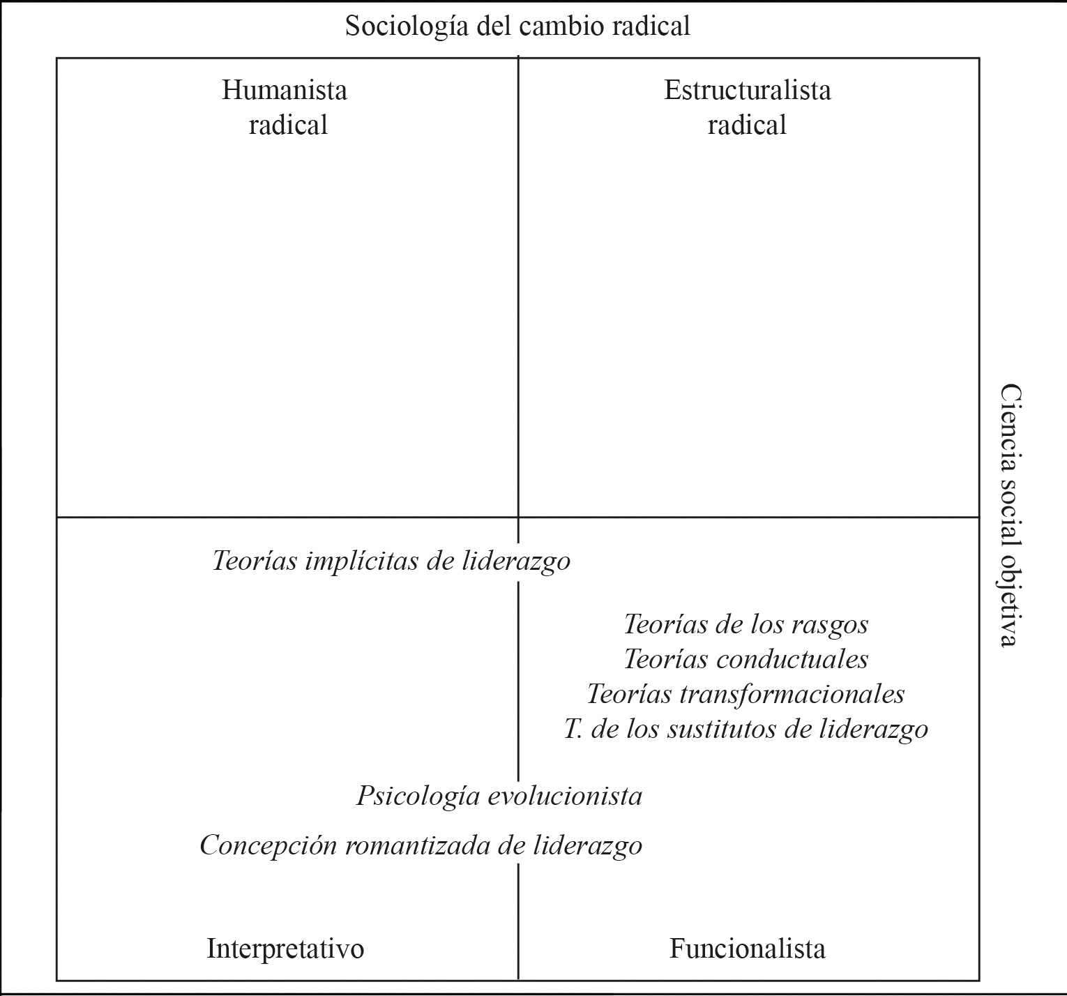 Al margen de lo anterior, mención especial merece el hecho de que no se identifiquen teorías de liderazgo radical humanista y radical estructuralista. Vieja es la crítica de que la investigación funcionalista fomenta la alienación del empleado y su subyugación por parte de las élites[1] (Frost, 1980). No obstante, esto no es inesperado si se considera que la mayoría de las teorías de liderazgo tienen una clara tendencia a generar conocimientos “útiles”, pues parte de la reafirmación de la dinámica objetiva entre líderes y seguidores. Pero, si para el humanismo radical el liderazgo como hecho objetivo no existe, ¿cómo podría haber una teoría enraizada en ese paradigma que abordara el tema? En ese paradigma se encuadra el trabajo de Western (2008), quien analizó los discursos de liderazgo en administración para generar una agenda de cambio y derrocar ideologías opresivas.