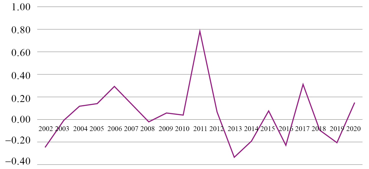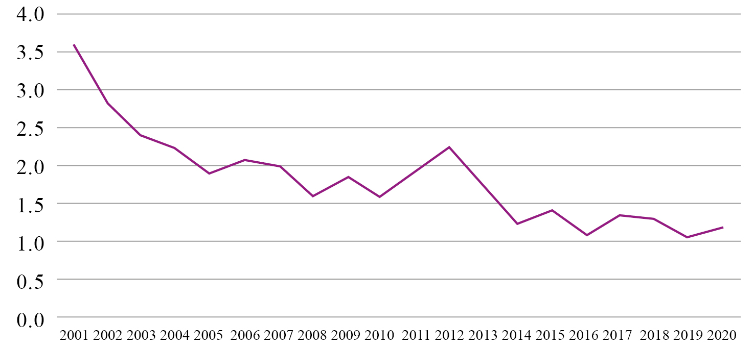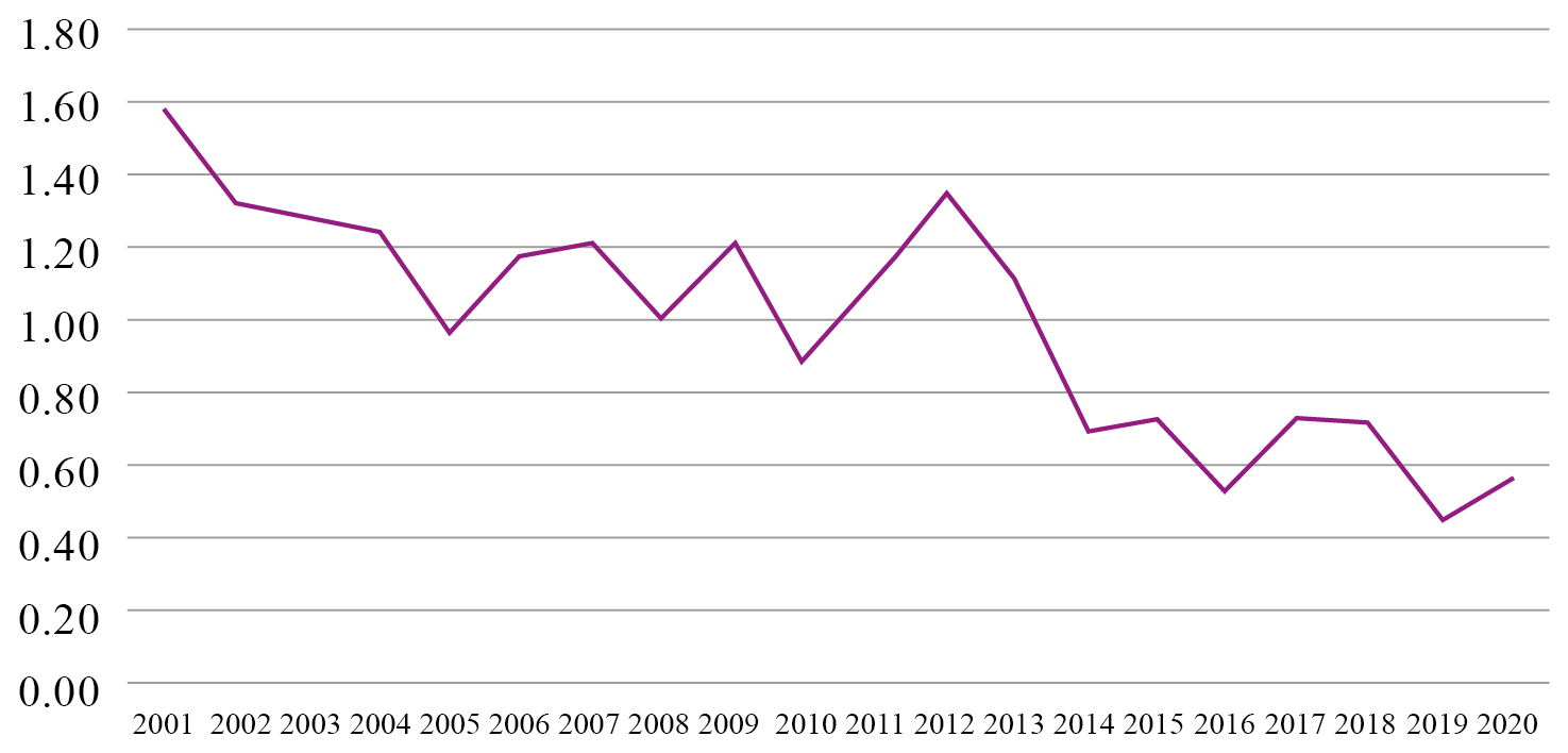 La contribución de México al mundo en cuanto a las exportaciones ha disminuido de forma continua, pues ha pasado de 3.6% en 2001 a 1.2% en 2020; es decir, poco más de dos puntos porcentuales perdidos en dos décadas. Los resultados coinciden con los señalamientos de Valencia (2016), quien afirma que las exportaciones de café en México han ocasionado pérdida de competitividad en el contexto internacional (gráfica 4).