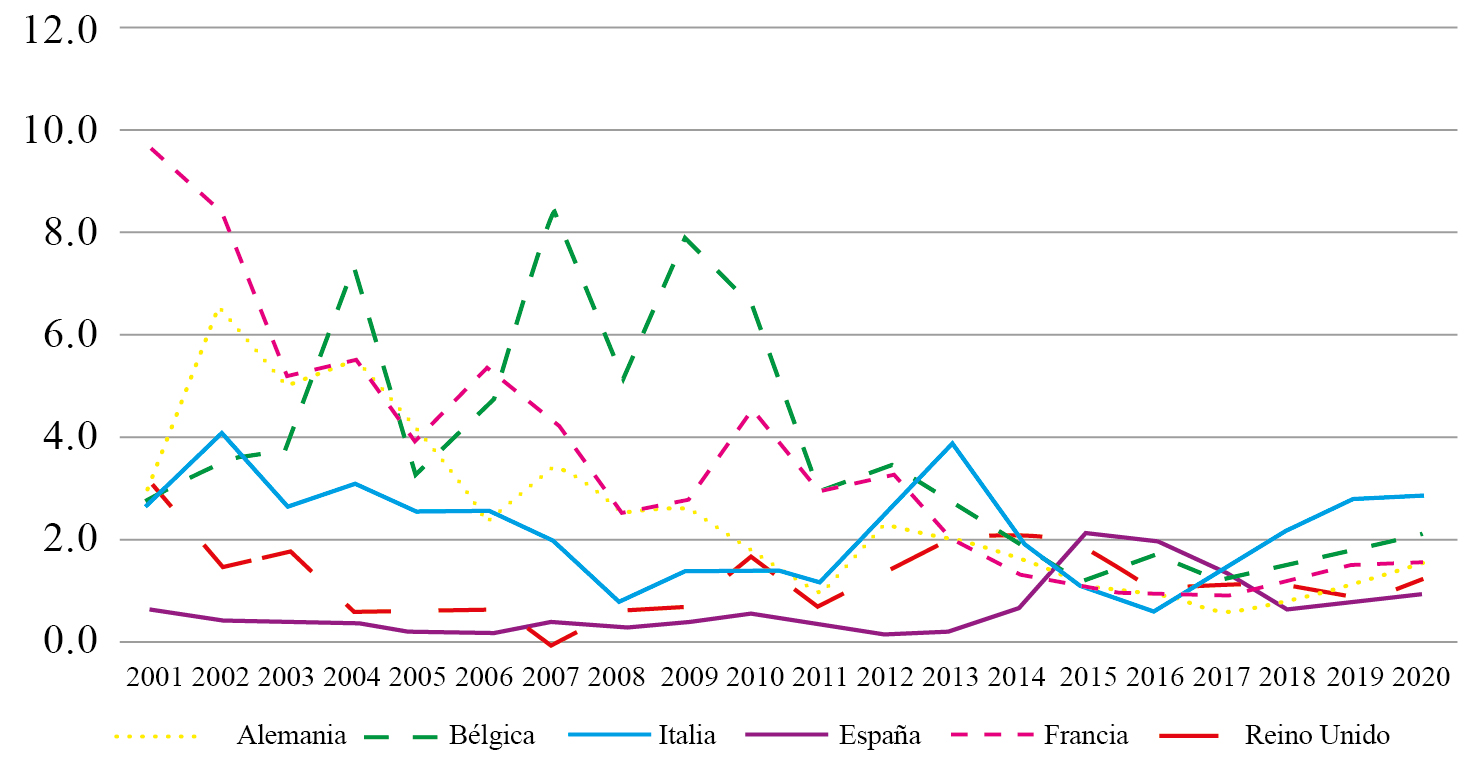 Similar con los resultados anteriores sobre la situación del café de origen mexicano en sus principales destinos europeos, en la gráfica 6 se aprecia que en los diferentes países el aromático ha perdido competitividad, incluso en Francia, donde se mostró ventaja comparativa fuerte con valores de 9.6% y 4.4% hasta 2007, incluso mejor que en Alemania, cuyo valor más significativo se dio en 2002 (6.6%). De este último, es necesario mencionar que los resultados oscilan entre 3.3% en el inicio del periodo y al final del mismo la cifra es de 1.6%; es decir, en casi 20 años se perdió la mitad de la competitividad. En España la competitividad se clasificó como débil entre 2015 y 2016 con cifras de 2.0, pero para 2020 se tuvo una competitividad de 1%; en otros términos, en cuatro años se perdió la mitad de la ventaja competitiva que se tenía de forma similar a lo vivido en Alemania. Por su parte, Italia es el único país donde al fin del periodo de análisis mantuvo una ventaja comparativa media. Entre 2018 y 2020 se aprecia una ligera recuperación de las exportaciones mexicanas; no obstante, se cataloga como ventaja comparativa débil.