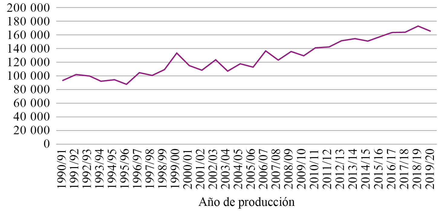 Existen tres tendencias en la productividad: a) aumento constante, b) un binomio de volatilidad-estabilidad, c) cambios climáticos adversos reflejados en las fuertes lluvias seguida de altas temperaturas y sequías graves con repercusiones en el cultivo y cosecha del cafeto que favorecen el desarrollo de plagas, las cuales muestran la vulnerabilidad y exposición del caficultor (Ocampo y Álvarez, 2017; Jiménez-Torres y Massa-Sánchez, 2015). Como consecuencia, la ICO señala que en el año cafetero 2019-2020 se produjeron 165 053 millones de sacos (de 60 kg cada uno), es decir, 71 823 millones de sacos más que en su equivalente de 1990-1991 (gráfica 1).
