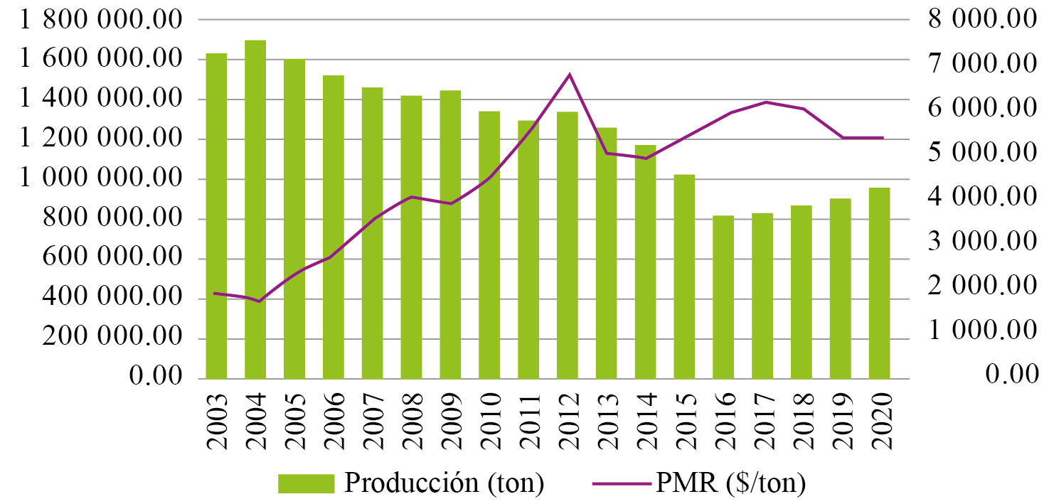 Sin embargo, la producción del café ha disminuido en los últimos años al pasar de 1 621 938.34 t en 2003 a 953 682.9 t en 2020, es decir, casi 41% menos en 17 años; este declive se ha dado a causa de diferentes enfermedades y plagas en los cafetales, cambio climático, además de la falta de políticas públicas que apoyen al productor, factores que lo obligan más bien a mudar de actividad, ya que viven en la marginalidad (CEDRSSA, 2019; Espinosa-García et al., 2016). Además, Díaz (2021: 8) agrega como factores de la baja producción: