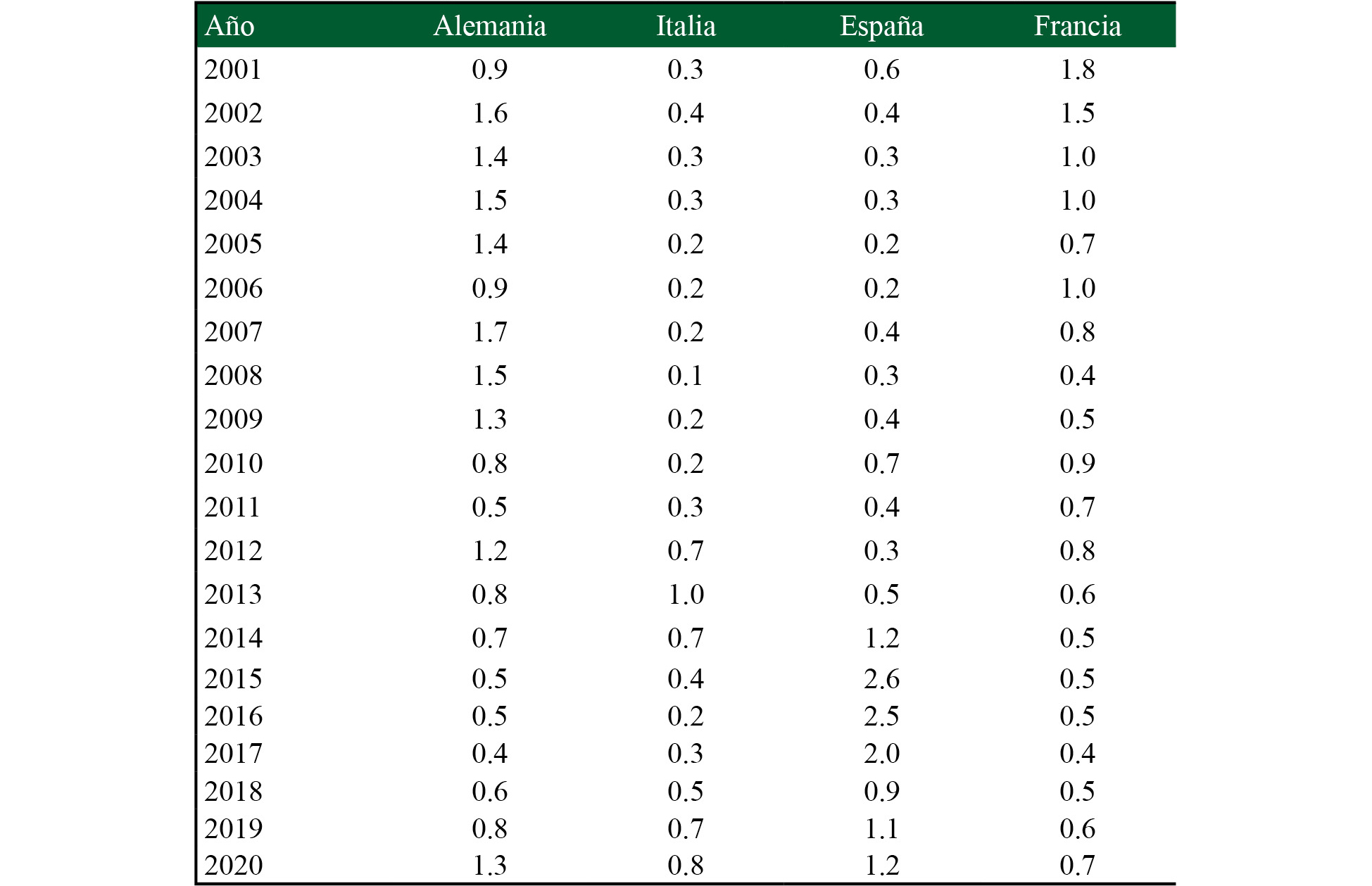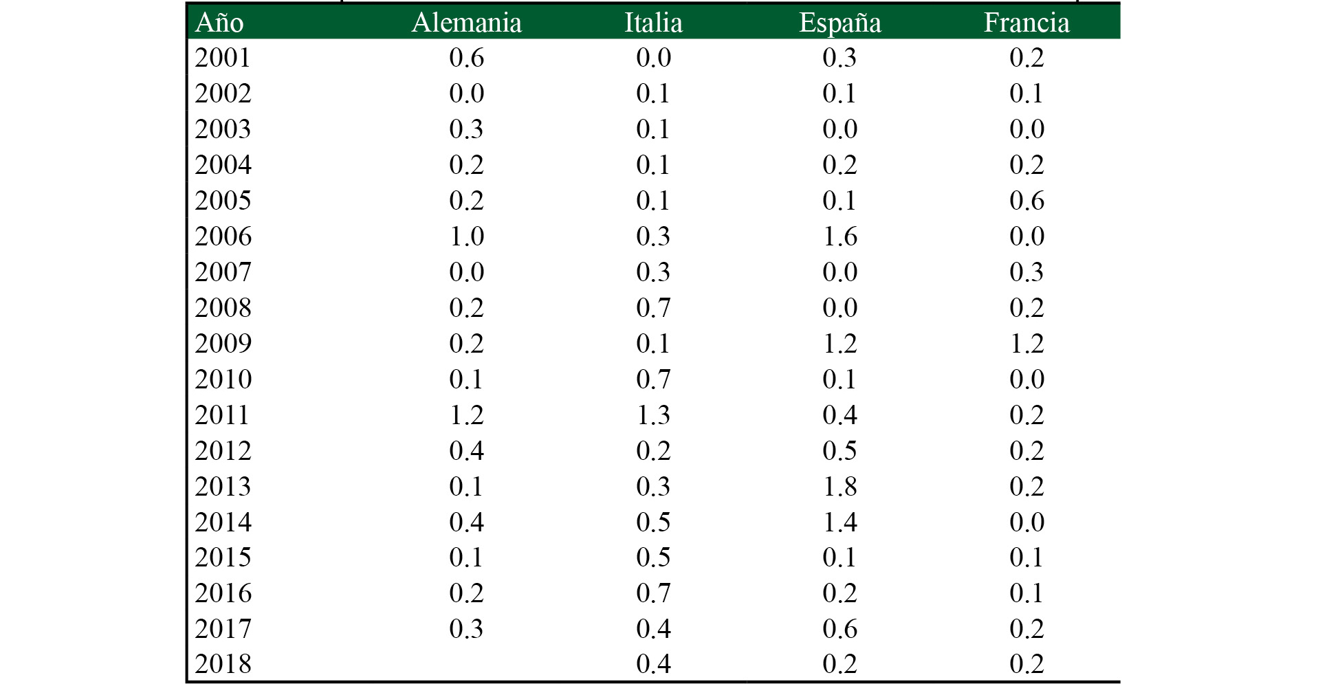 Pese a que España encabeza la lista de los principales destinos europeos del aromático nacional, las importaciones no han aumentado de forma sustancial. Al respecto, se observa que 2015 fue el mejor año de adquisiciones para el grano en aquel país, lo cual en gran medida se debe a que, de acuerdo con Gómez y García (2017), no hay promoción suficiente para difundir el café de origen mexicano; refieren, incluso, su desconocimiento. En el mercado europeo, Alemania es el principal importador de café cuyo principal proveedor es Brasil; sin embargo, aunque es el tercer país europeo en adquirir el café mexicano el promedio es un punto porcentual en el periodo analizado. En el caso de Italia se encontró que si bien la competitividad en promedio es menor a la unidad (0.4%), se nota un crecimiento mínimo en el valor final. En Francia la situación del grano es preocupante, pues a diferencia de los anteriores, las importaciones disminuyen de forma paulatina (cuadro 1).