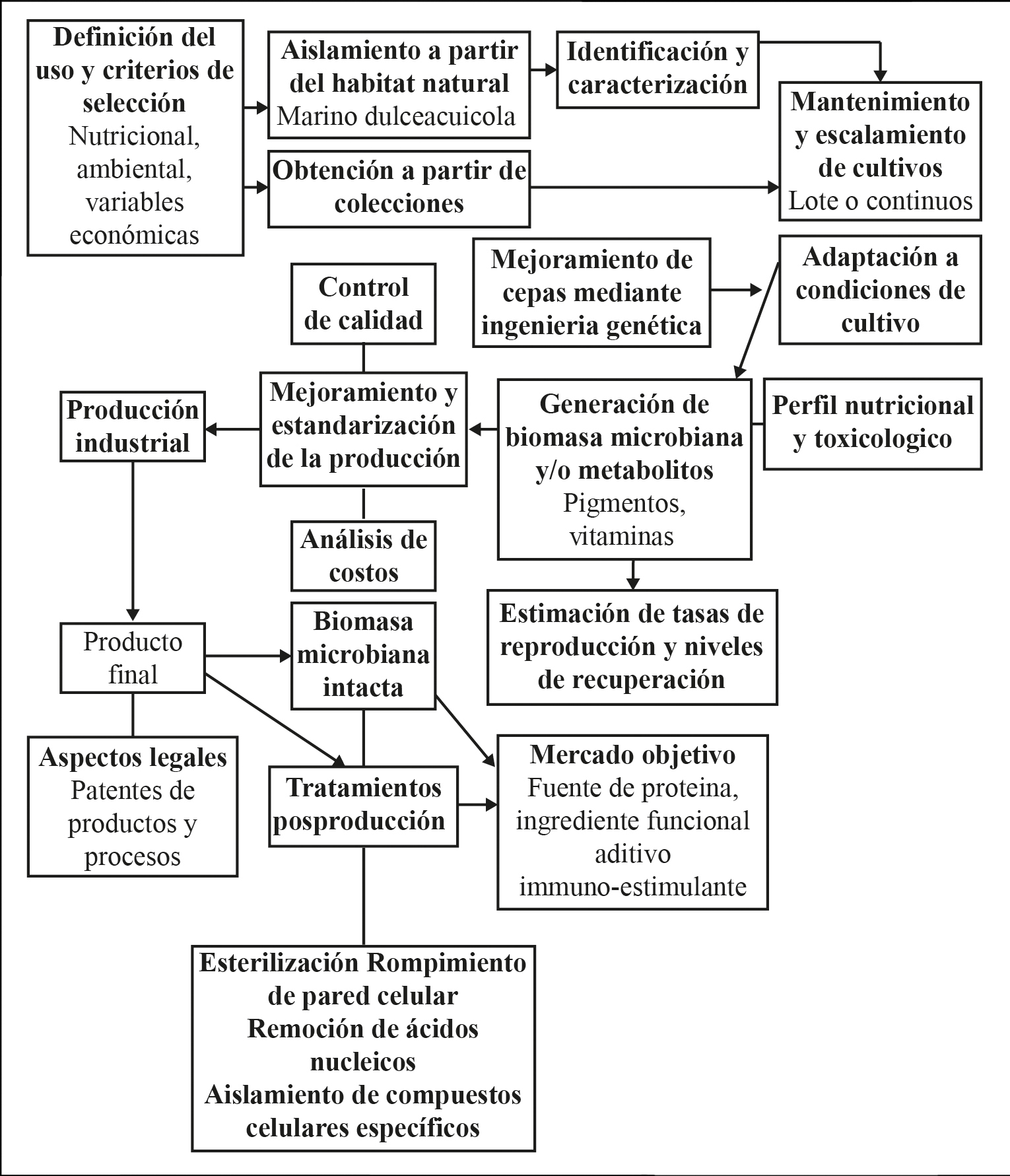 Gracias a la investigación aplicada, la generación continua de biomasa microbiana en fermentadores y fotobiorreactores ha alcanzado una escala industrial. En la actulidad, las metodologías establecidas permiten predecir un incremento significativo en el número de especies cultivadas, así como en el rango de aplicaciones en la nutrición humana y en la nutrición animal. El escalamiento comienza con la selección cuidadosa del microorganismo que se va a cultivar. El aislamiento de las primeras células y los cultivos iniciales son altamente controlados, ya que son cruciales para el eventual escalamiento a volúmenes mayores (figura 1). Muchos de los nuevos métodos de producción son independientes de las condiciones estacionales y pueden funcionar de manera continua; algunos de estos métodos de producción son capaces de generar, a partir de insumos no onerosos, biomasa bacteriana con calidad nutricional consistente. Diversos procesos industriales bien establecidos han apoyado el incremento de producción de microalgas, levaduras y bacterias. sta biomasa representaría el producto final o también puede ser un subproducto de un proceso primario, como en el caso de la producción de pigmentos y biocombustibles a partir de las microalgas (Gamboa-Delgado y Márquez-Reyes, 2018).