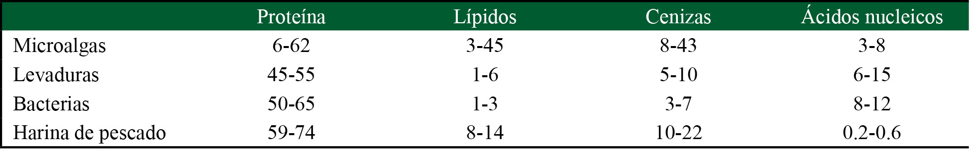 Una gran cantidad de microorganismos presenta buenos perfiles nutricionales tanto para el consumo humano como para el consumo de animales de cría. En general, las células completas de microalgas, levaduras y bacterias contienen un alto contenido de proteína (cuadro 1). El valor biológico de una proteína depende de su digestibilidad y de su composición de aminoácidos escenciales. Se considera que este valor es alto cuando las proporciones de aminoácidos son las adecuadas para fomentar el crecimiento de un organismo específico. Las proteínas derivadas de muchos microorganismos han sido consideradas como portadoras de un alto valor biológico gracias a los apropiados perfiles de aminoácidos para los organismos consumidores (Gamboa-Delgado y Márquez-Reyes, 2018). Por otro lado, el contenido de lípidos tiende a ser mayor en la biomasa derivada de las microalgas, mientras que la biomasa de bacterias y levaduras suele ser rica en proteína, pigmentos y vitaminas. Aunado a esto, se ha reportado que el perfil nutricional de bacterias y microalgas mejora significativamente mediante el uso de medios de cultivo y condiciones específicas de crecimiento (Ray et al., 2022). Algunos tipos de bacterias tienen paredes celulares que resultan más digeribles que aquellas encontradas en las microalgas y levaduras. A pesar de que las paredes celulares resultan indigeribles para algunos organismos consumidores, también representan una importante fuente de nutrientes debido a que se componen en su mayoría de polisacáridos y proteína. Cuando se compara con otros ingredientes, la biomasa microbiana representa una fuente insuperable de ácidos nucleicos.