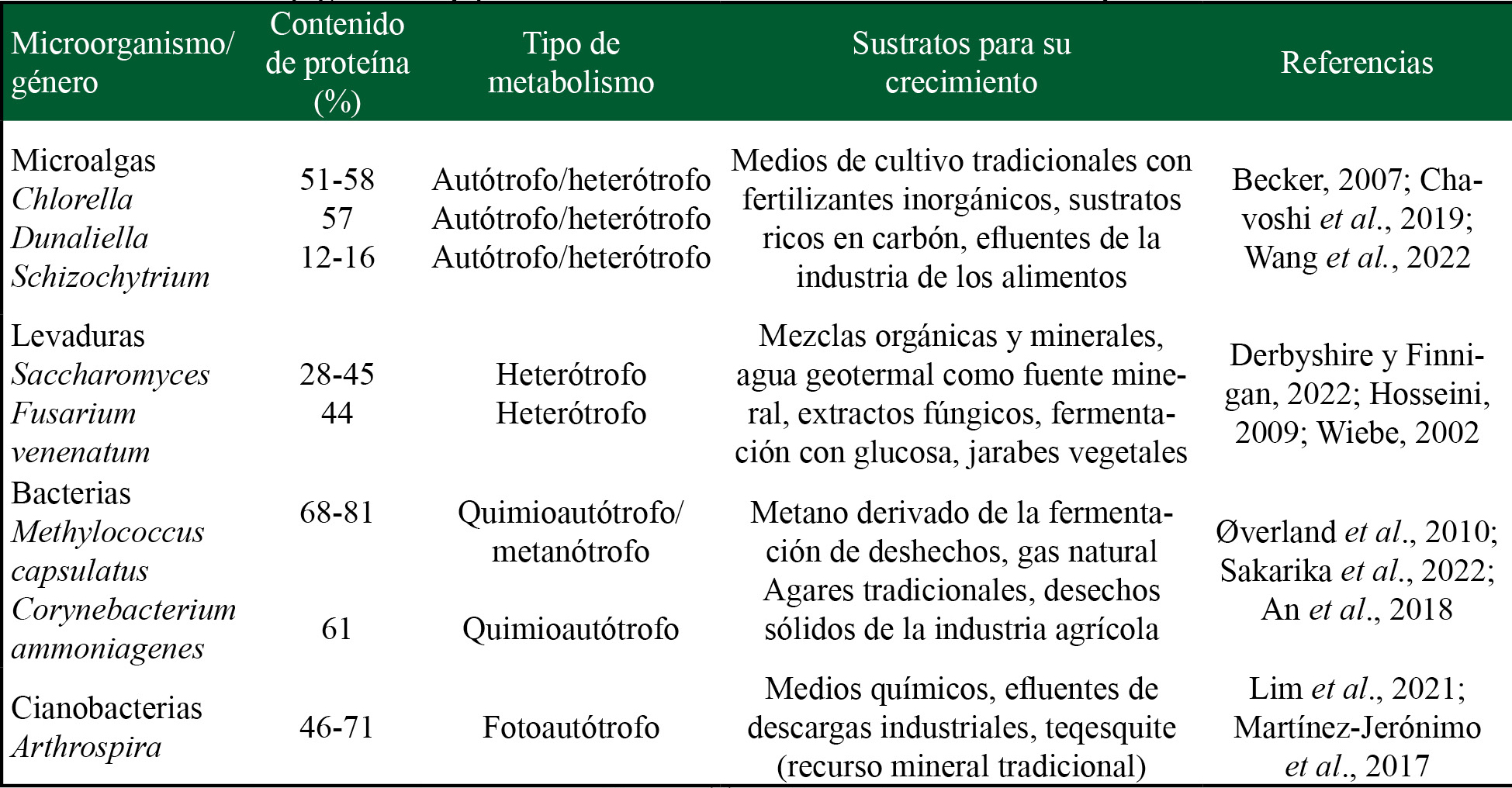 Los sistemas para producir biomasa a partir de microorganismos son muy variados y pueden consistir en fermentadores, fotobiorreactores y diversos tipos de contenedores. Un gran número de especies de microorganismos son tolerantes a amplios rangos de temperatura, salinidad y a otros parámetros fisicoquímicos. Aunado a esto, son muy eficientes al convertir una variedad de sustratos a partir de los cuales obtienen sus nutrientes, lo cual deriva en una versátil y rápida producción de biomasa microbiana. Por otro lado, los microorganismos también se clasifican de acuerdo con las fuentes de carbono y energía que son capaces de utilizar. Dicha diversidad metabólica ha permitido su producción sustentable a través de una amplia gama de fuentes de energía (luz solar o luz artificial para las microalgas y cianobacterias) y sustratos de carbono, que van desde agares comerciales hasta residuos agrícolas, efluentes de fábricas de alimentos y gas metano (Lim et al., 2021; Owsianiak et al., 2022). Las técnicas de producción existentes se pueden adaptar a esta diversa variedad metabólica microbiana (tabla 1) y, gracias a la ingeniería genética, también es posible lograr lo contrario, es decir, adaptar genéticamente los microorganismos a las técnicas y condiciones de producción disponibles.