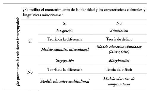 Así, se pretende dar cuenta de los modelos educativos existentes a partir de la combinación de las respuestas que se dan a estas dos cuestiones: en qué medida la escuela facilita el mantenimiento de la identidad y las características culturales y lingüísticas minoritarias, en primer lugar, y, en segundo lugar, si se promueven o no las relaciones intergrupales (Martín Rojo, 2003) .