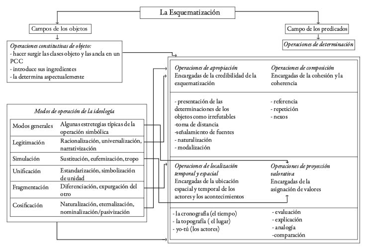 Enseguida, éstas fueron analizadas a la luz del esquema integrativo propuesto por Gutiérrez Vidrio (2003), donde confluyen el modelo de operaciones lógico-discursivas ideado por Grize (1982) y los cinco modos de operación de la ideología postulados por Thompson (1993) (incluido en el Anexo de este trabajo).